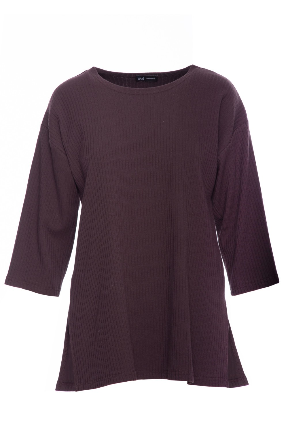 Bluzka oversize z prążkowanej dzianiny wykonana z miękkiej, prążkowanej dzianiny o gramaturze 250 g. Luźny, prosty fason z dekoltem okrągłym pod szyję i rękawami 3/4, lekko szerokimi. Po bokach znajdują się subtelne rozcięcia, które dodają lekkości i swobody ruchu. Idealna do casualowych stylizacji z jeansami lub do kompletu ze spodniami z tej samej dzianiny.