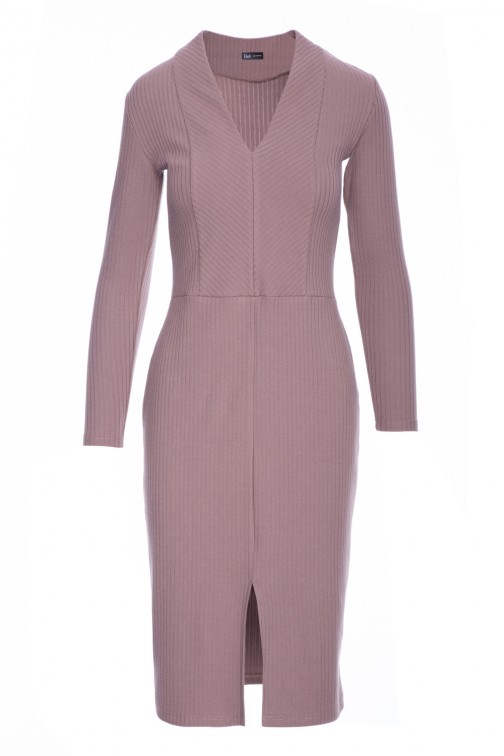 DM1486 Prążkowana sukienka ołówkowa z długimi rękawami - kakaowa
