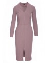 Dopasowana sukienka prążkowana wykonana z dzianiny o gramaturze 250 g. Fason podkreślający sylwetkę z dekoltem w kształcie litery V i subtelnym rozcięciem z przodu u dołu. Idealna zarówno do pracy, jak i na wieczorne wyjścia – minimalistyczny krój pozwala łatwo tworzyć eleganckie lub casualowe stylizacje.
