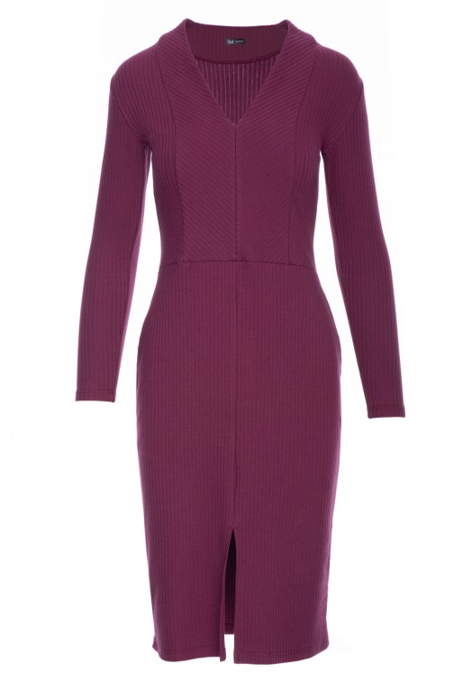 DM1486 Prążkowana sukienka ołówkowa z długimi rękawami - śliwkowa