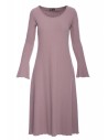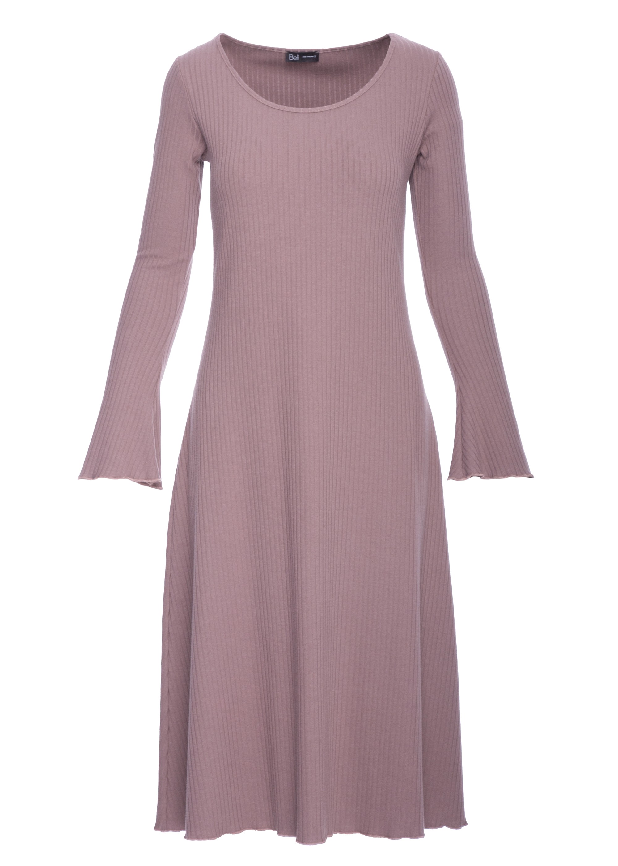 Swobodna sukienka prążkowana wykonana z dzianiny o gramaturze 250 g. Fason lekko rozkloszowany z dopasowaną górą, falowanymi rękawami i dołem. Minimalistyczny, kobiecy krój sprawia, że sukienka doskonale sprawdza się w codziennych stylizacjach, do pracy oraz na spotkania – łatwo zestawić ją zarówno z eleganckimi, jak i casualowymi dodatkami.