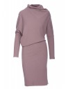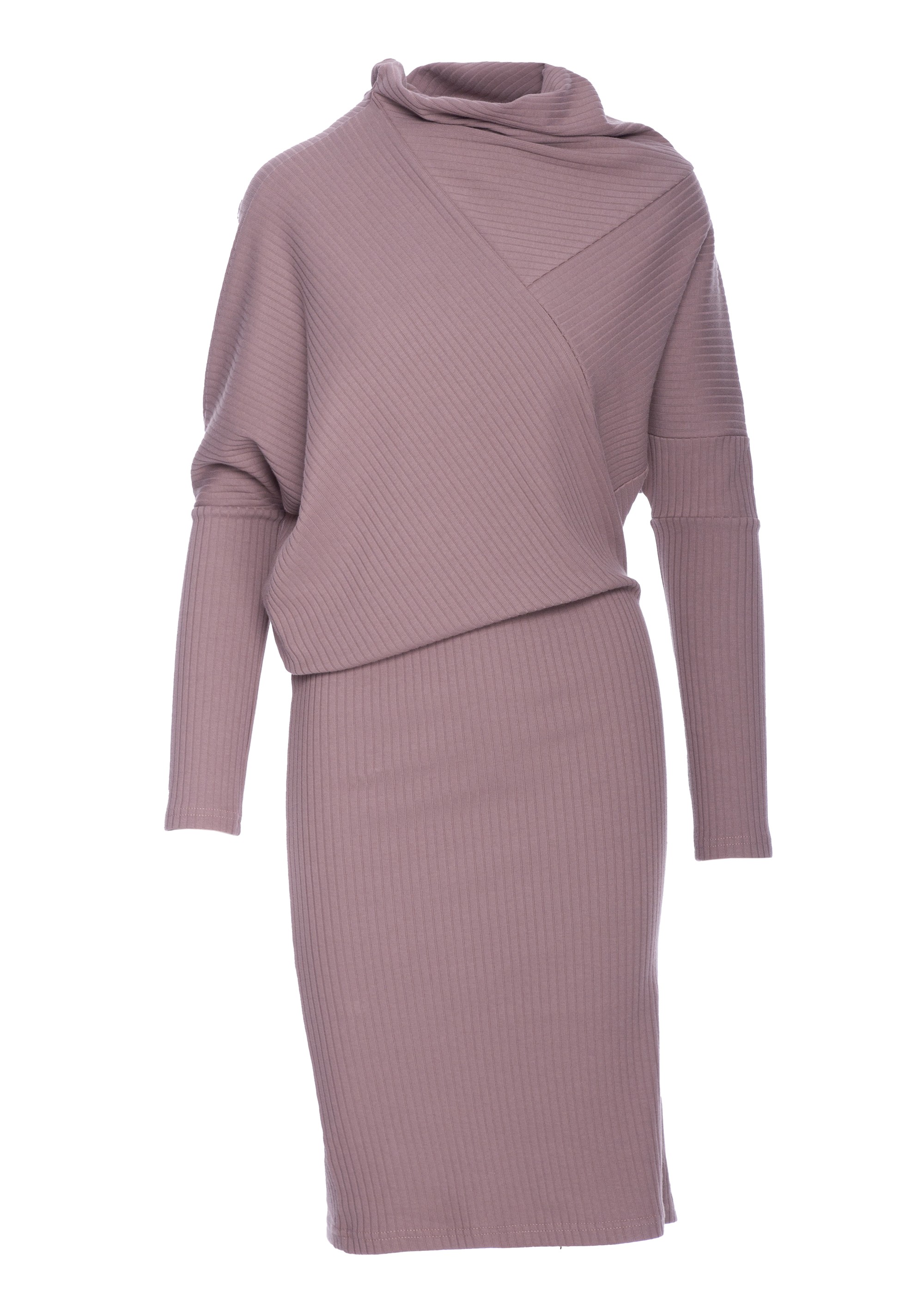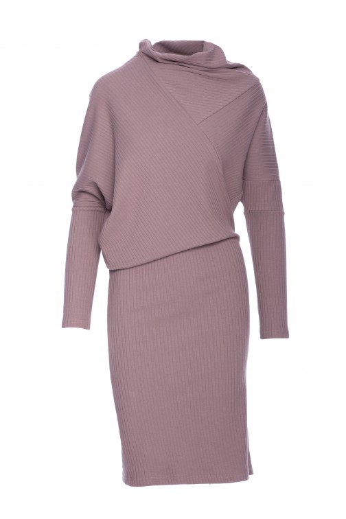Nowoczesna sukienka z prążkowanej dzianiny o kobiecym kroju, który łączy luźną górę z dopasowanym dołem. Fason z wysoką stójką, rękawami typu nietoperz i ołówkowym dołem subtelnie podkreśla talię oraz dodaje sylwetce lekkości. Idealna zarówno na spotkania, wyjścia ze znajomymi, jak i wieczorne okazje – w zależności od dodatków może mieć casualowy lub elegancki charakter.
