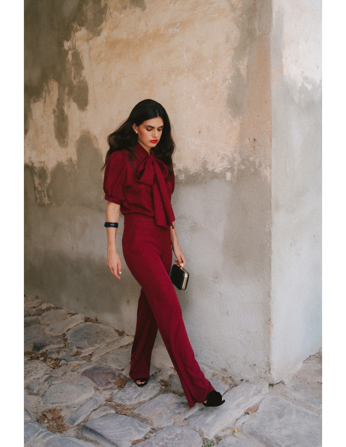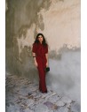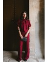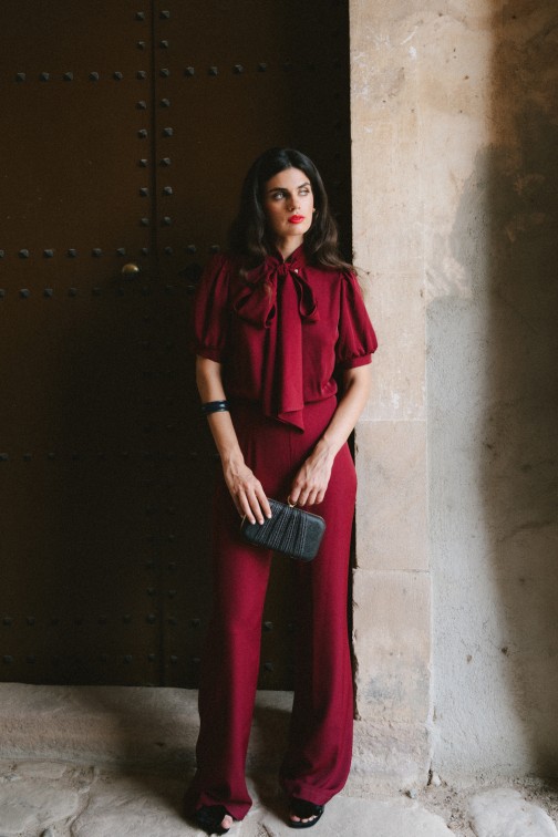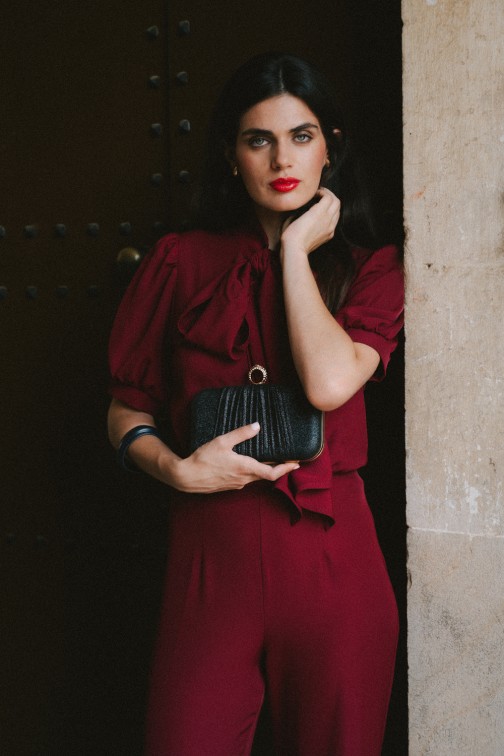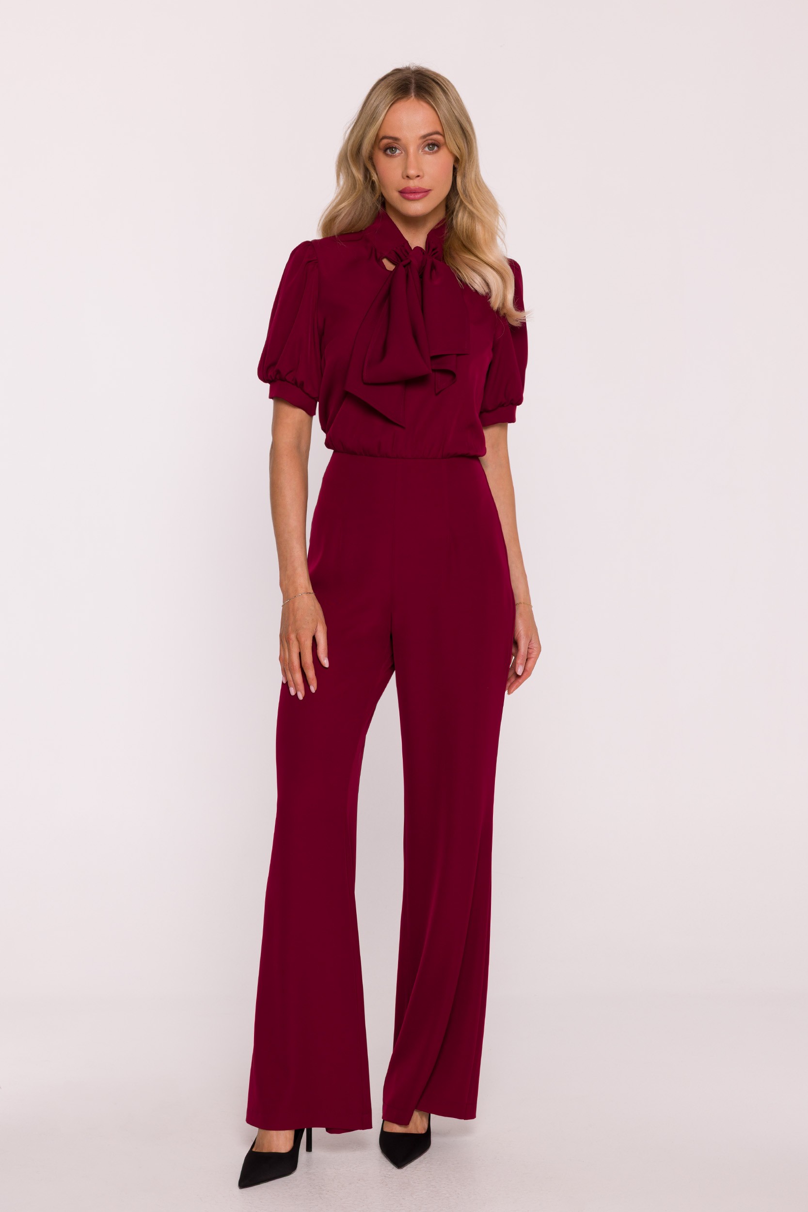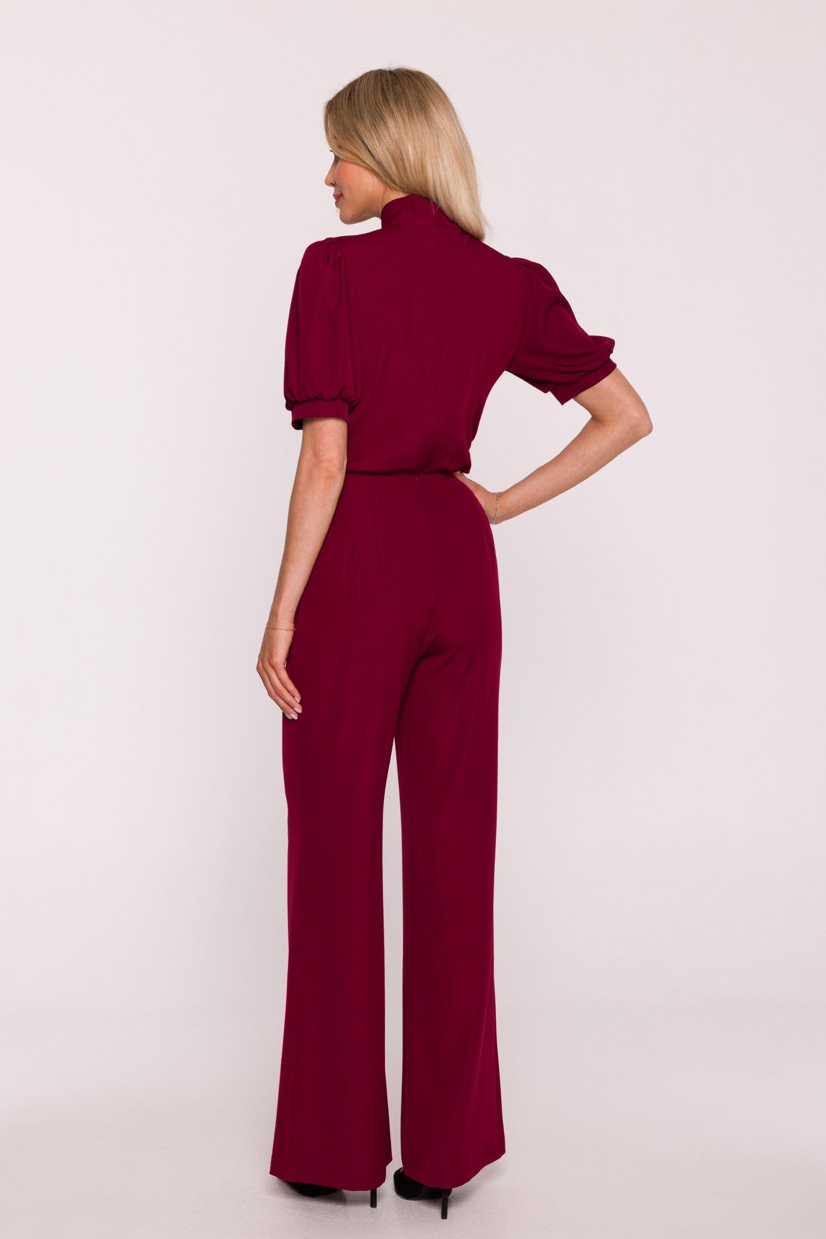 Elegancki kombinezon z gładkiej tkaniny o lekkim połysku, który łączy nowoczesny styl z klasyczną kobiecością. Góra z dekoltem w kształcie litery V i wiązaną stójką subtelnie podkreśla szyję, a bufiaste rękawy nadają całości lekkości i romantyzmu. Dopasowana talia i szerokie nogawki tworzą zrównoważony, wysmuklający fason. To idealna propozycja na eleganckie przyjęcia, uroczystości lub wyjątkowe spotkania.