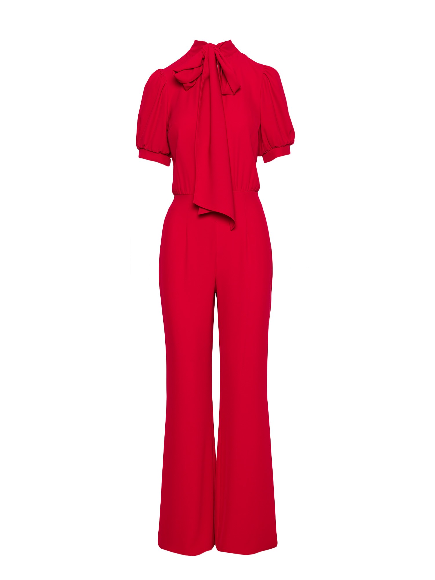 Elegancki kombinezon z gładkiej tkaniny o lekkim połysku, który łączy nowoczesny styl z klasyczną kobiecością. Góra z dekoltem w kształcie litery V i wiązaną stójką subtelnie podkreśla szyję, a bufiaste rękawy nadają całości lekkości i romantyzmu. Dopasowana talia i szerokie nogawki tworzą zrównoważony, wysmuklający fason. To idealna propozycja na eleganckie przyjęcia, uroczystości lub wyjątkowe spotkania.