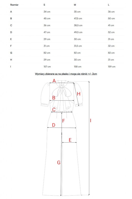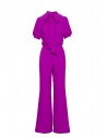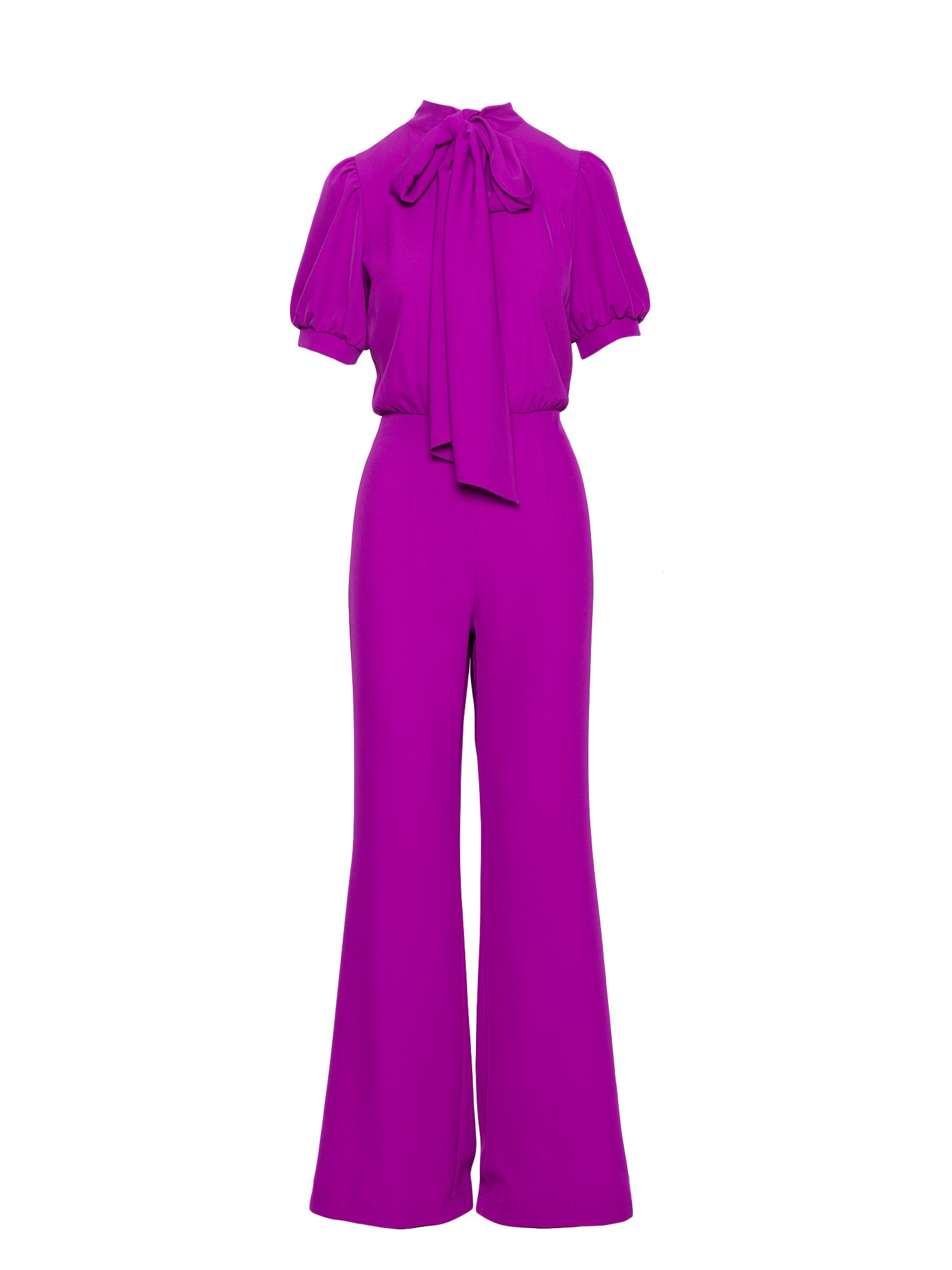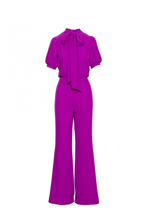 Elegancki kombinezon z gładkiej tkaniny o lekkim połysku, który łączy nowoczesny styl z klasyczną kobiecością. Góra z dekoltem w kształcie litery V i wiązaną stójką subtelnie podkreśla szyję, a bufiaste rękawy nadają całości lekkości i romantyzmu. Dopasowana talia i szerokie nogawki tworzą zrównoważony, wysmuklający fason. To idealna propozycja na eleganckie przyjęcia, uroczystości lub wyjątkowe spotkania.