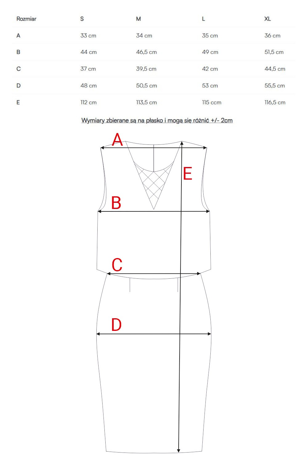 Fason eleganckiej sukienki ołówkowej z dwuwarstwową górą. Dopasowany dół pięknie podkreśla kobiecą sylwetkę, a luźniejsza góra z koronkowym detalem dodaje lekkości i szyku. Długość za kolano zapewnia ponadczasową elegancję.