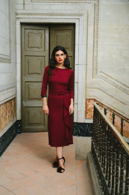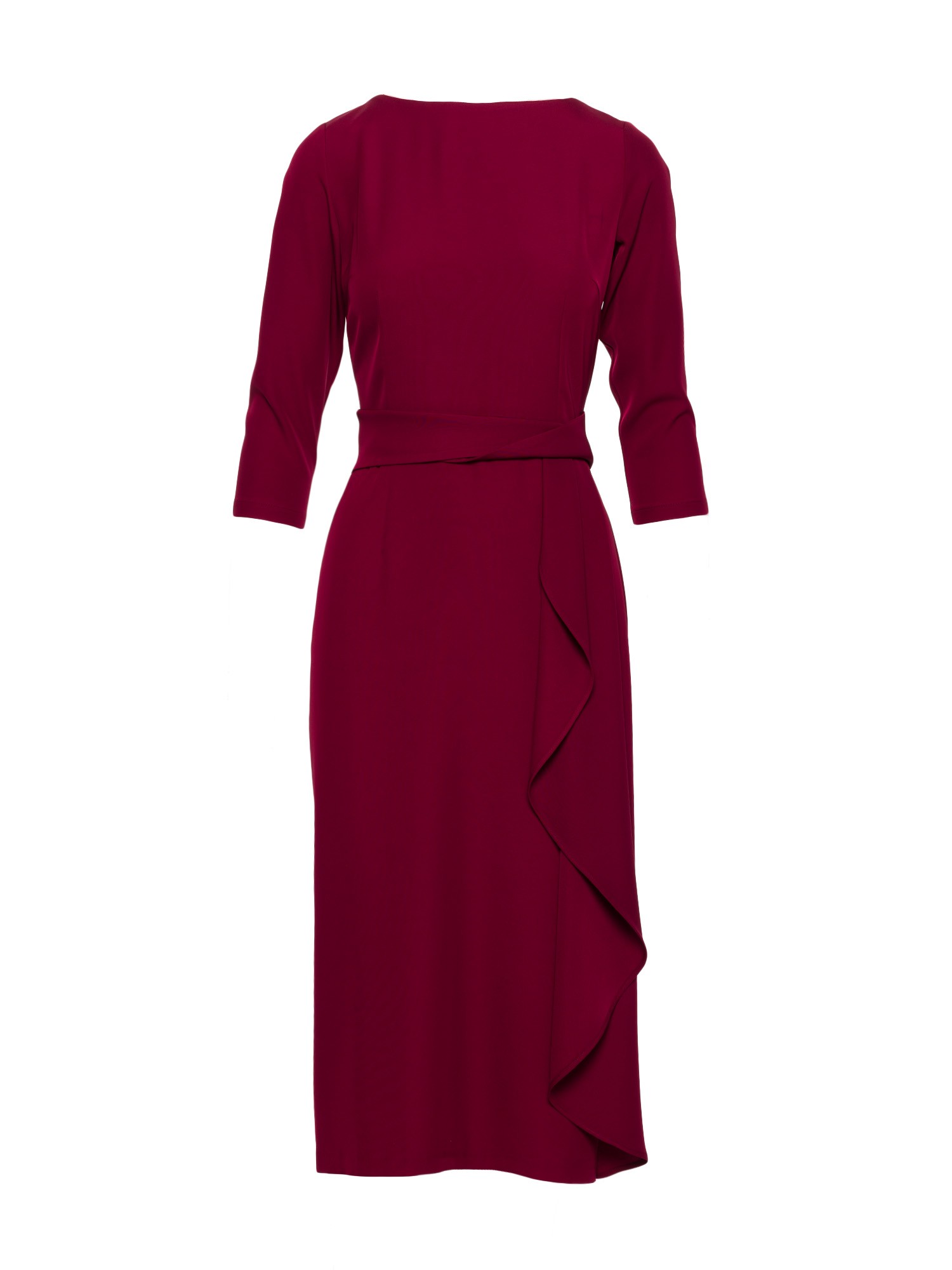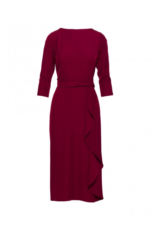 Elegancka sukienka z ozdobną falbaną - bordowa