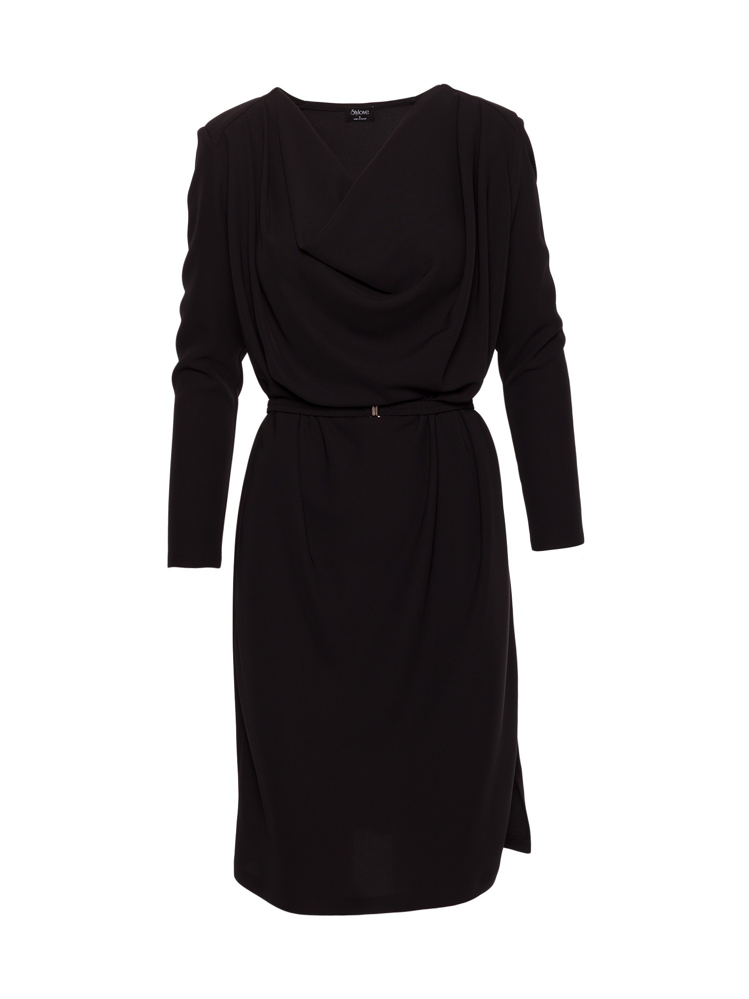 Fason eleganckiej sukienki ołówkowej z dekoltem typu woda. Luźniejsza góra miękko układa się na sylwetce, a dopasowany dół podkreśla kobiece kształty. Elastyczny pasek w talii zapewnia komfort i idealne dopasowanie. Długość przed kolano gwarantuje klasyczny, szykowny wygląd.