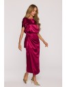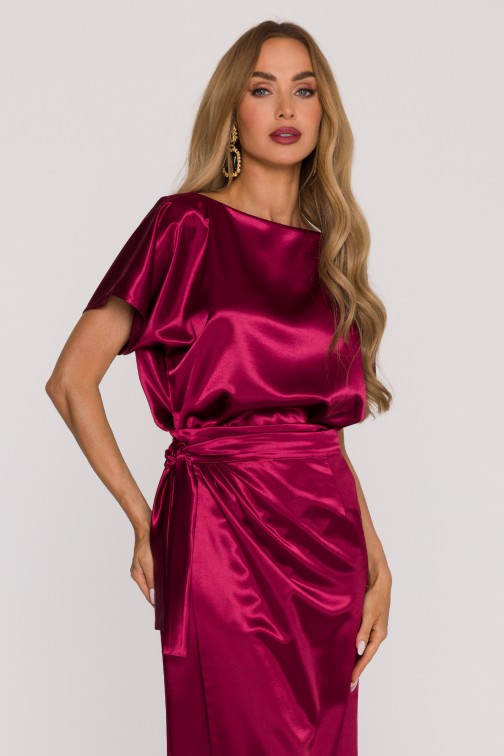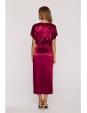 Elegancka satynowa sukienka midi to wyjątkowa propozycja dla kobiet, które cenią subtelny połysk, lekkość i kobiecy szyk. Wykonana z mięsistej, gładkiej satyny, pięknie układa się na sylwetce, podkreślając jej naturalne kształty. Góra z dekoltem typu łódka i luźnymi rękawami zapewnia swobodę, a charakterystyczny dół wiązany jak pareo pozwala dopasować fason do figury. Dzięki możliwości noszenia góry wciągniętej lub luźno wypuszczonej ze spódnicy, sukienka zyskuje uniwersalny i modny charakter. Idealna na eleganckie przyjęcia, bankiety, wesela czy wieczorne wyjścia – zawsze wygląda z klasą i ponadczasową elegancją.