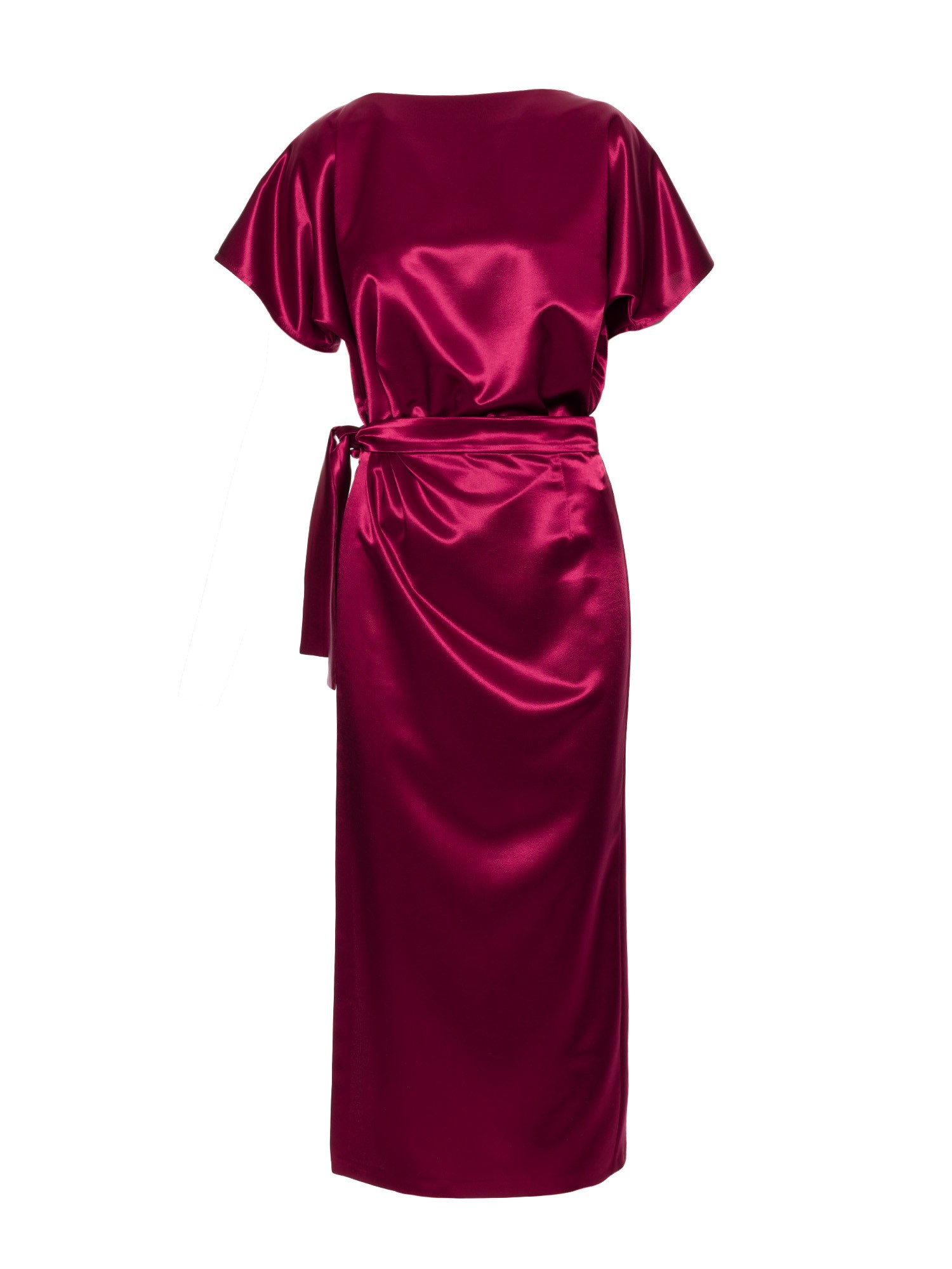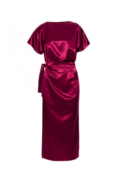 Efektowna satynowa sukienka o połyskującym wykończeniu, która dzięki unikatowemu projektowi jest łatwa do dopasowania. Dół sukienki jest otwarty i wiązany niczym pareo, a górna część może być wciągnięta do spódnicy lub luźno wypadać. Ten model doskonale sprawdzi się na wyjątkowe okazje – eleganckie przyjęcia, bankiety, wesela czy wieczorne wyjścia.