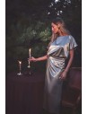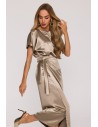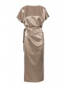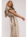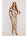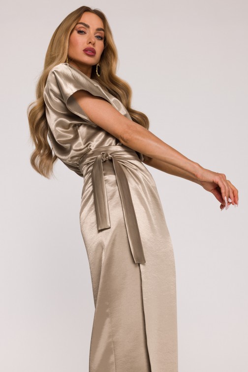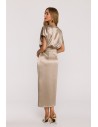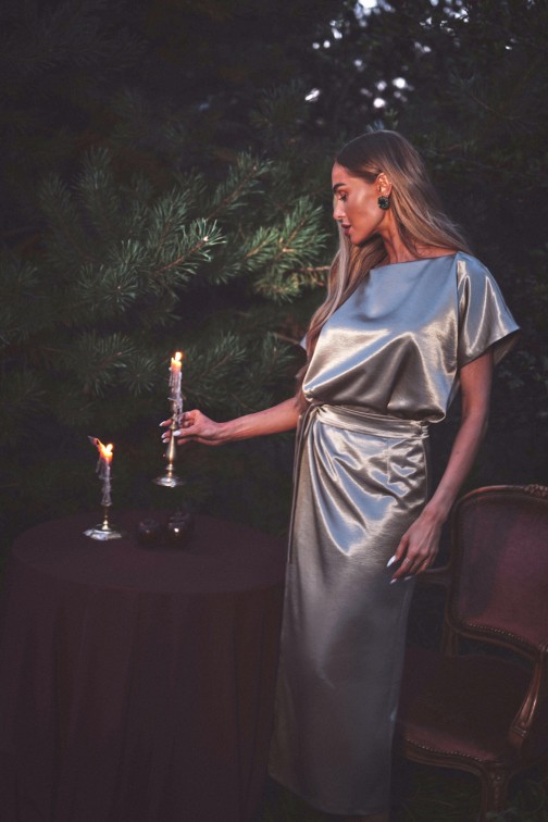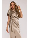 Efektowna satynowa sukienka o połyskującym wykończeniu, która dzięki unikatowemu projektowi jest łatwa do dopasowania. Dół sukienki jest otwarty i wiązany niczym pareo, a górna część może być wciągnięta do spódnicy lub luźno wypadać. Ten model doskonale sprawdzi się na wyjątkowe okazje – eleganckie przyjęcia, bankiety, wesela czy wieczorne wyjścia.