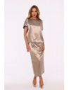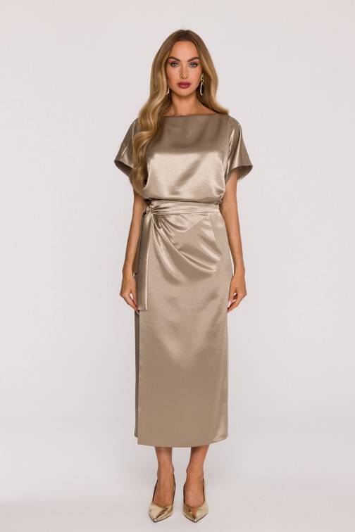 Elegancka satynowa sukienka midi to wyjątkowa propozycja dla kobiet, które cenią subtelny połysk, lekkość i kobiecy szyk. Wykonana z mięsistej, gładkiej satyny, pięknie układa się na sylwetce, podkreślając jej naturalne kształty. Góra z dekoltem typu łódka i luźnymi rękawami zapewnia swobodę, a charakterystyczny dół wiązany jak pareo pozwala dopasować fason do figury. Dzięki możliwości noszenia góry wciągniętej lub luźno wypuszczonej ze spódnicy, sukienka zyskuje uniwersalny i modny charakter. Idealna na eleganckie przyjęcia, bankiety, wesela czy wieczorne wyjścia – zawsze wygląda z klasą i ponadczasową elegancją.