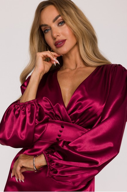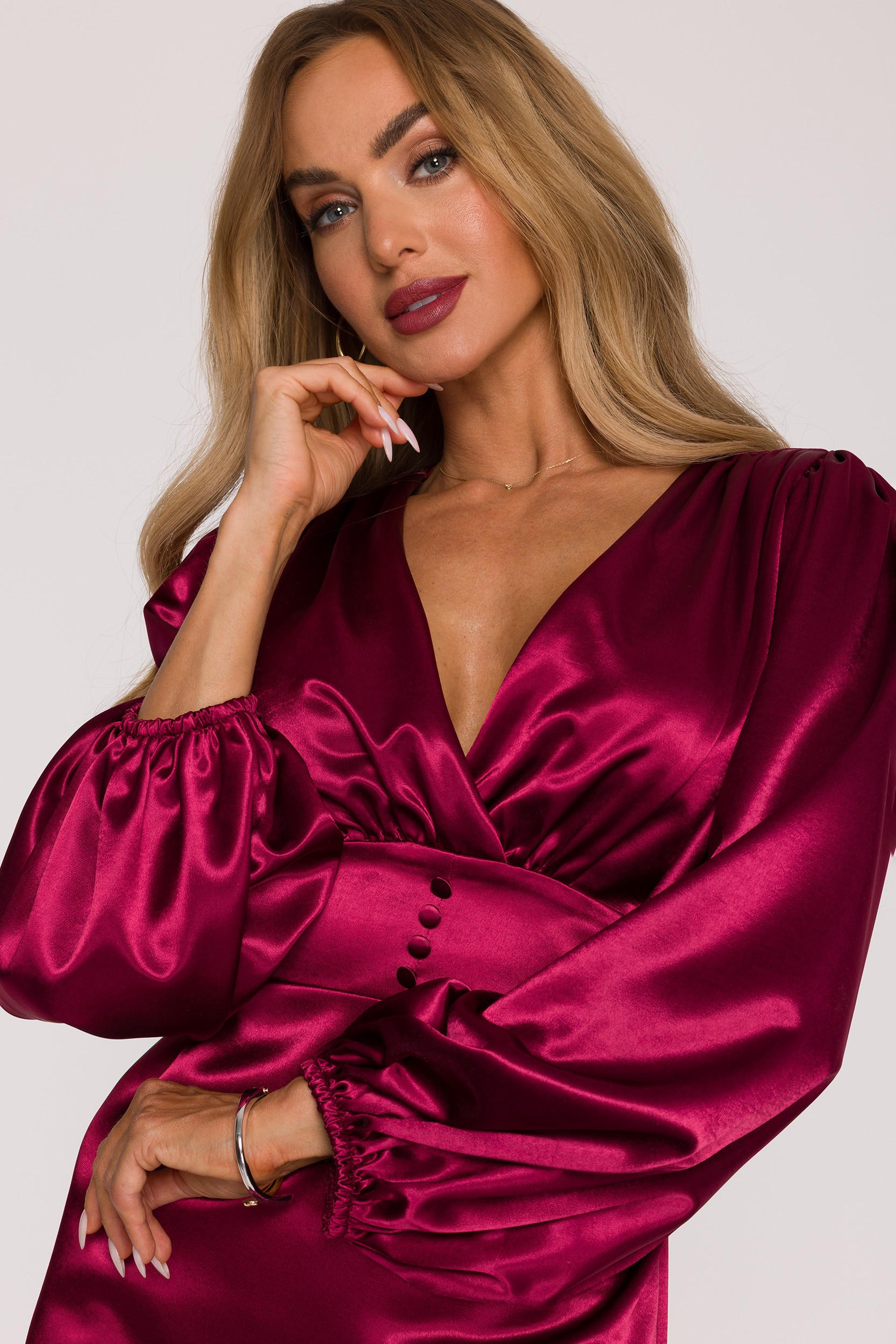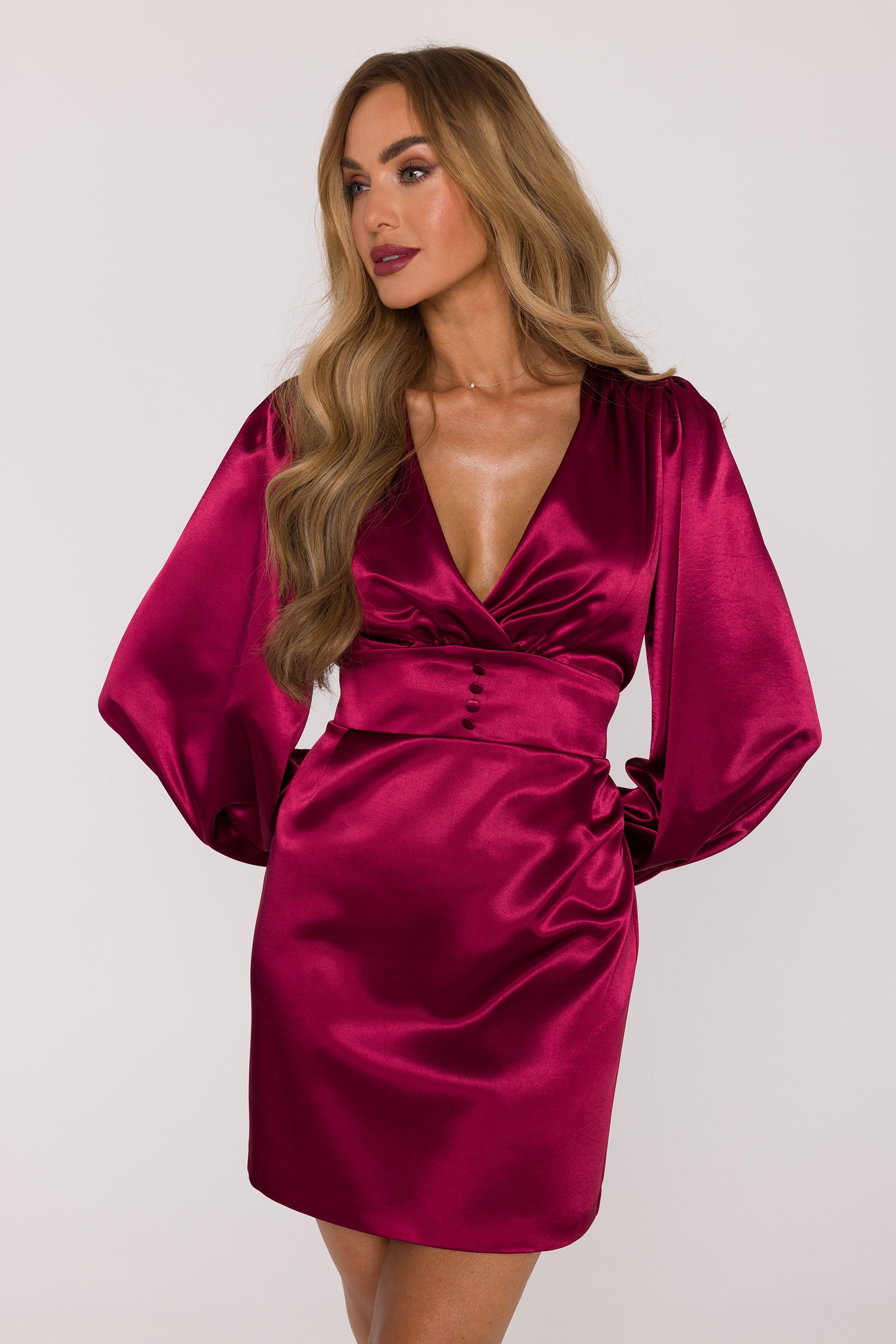 Elegancka satynowa sukienka mini to połączenie kobiecości, klasy i subtelnego połysku. Wykonana z miękkiej, mięsistej satyny, pięknie układa się na sylwetce, podkreślając jej naturalne kształty. Kopertowy dekolt w serek eksponuje linię szyi i biustu, a szeroki pas z dekoracyjnymi guzikami akcentuje talię. Bufiaste rękawy zakończone gumką dodają lekkości i romantycznego charakteru. To model, który doskonale sprawdzi się podczas wyjątkowych okazji – rodzinnych uroczystości, przyjęć, randek czy eleganckich wieczornych wyjść.
