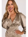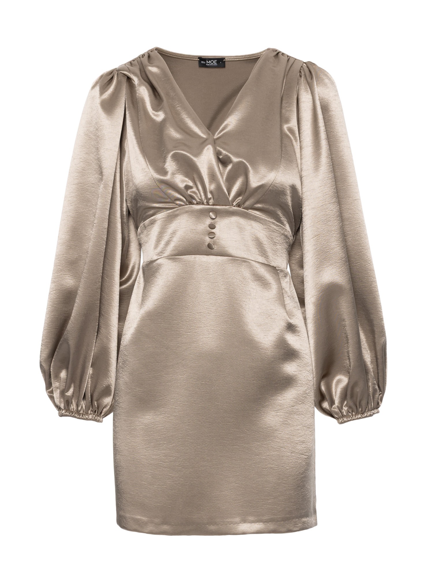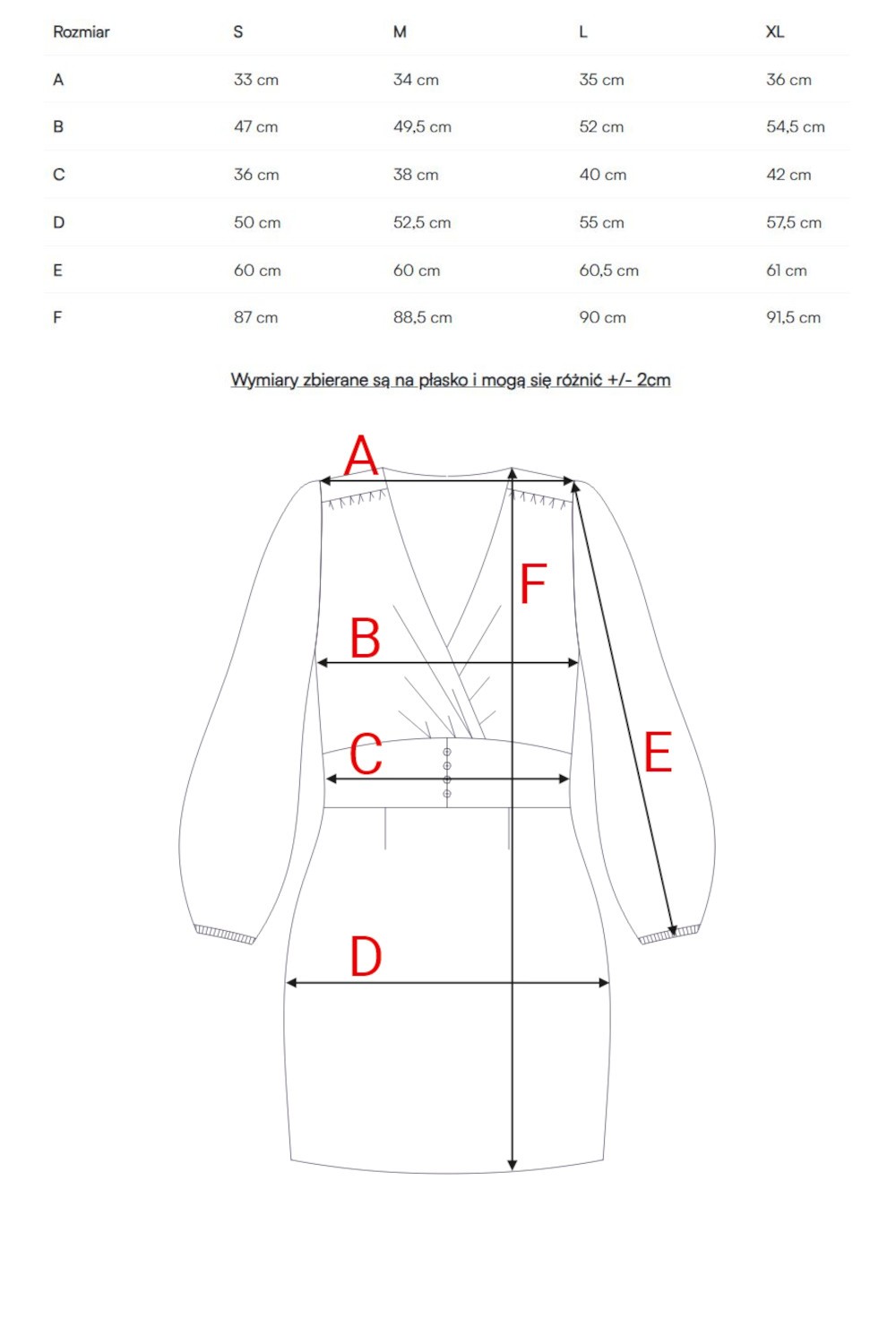 Elegancka satynowa sukienka mini to połączenie kobiecości, klasy i subtelnego połysku. Wykonana z miękkiej, mięsistej satyny, pięknie układa się na sylwetce, podkreślając jej naturalne kształty. Kopertowy dekolt w serek eksponuje linię szyi i biustu, a szeroki pas z dekoracyjnymi guzikami akcentuje talię. Bufiaste rękawy zakończone gumką dodają lekkości i romantycznego charakteru. To model, który doskonale sprawdzi się podczas wyjątkowych okazji – rodzinnych uroczystości, przyjęć, randek czy eleganckich wieczornych wyjść.