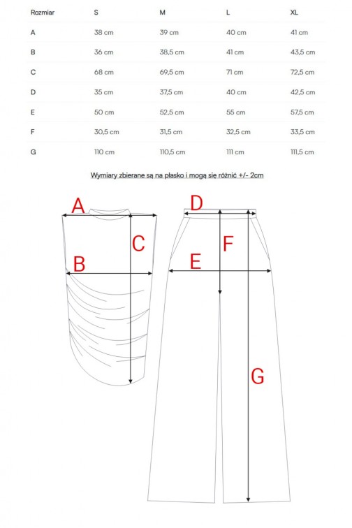 • Spodnie: długie, z szerokimi nogawkami, zakładki przy pasku, luźny krój zapewniający swobodę ruchu