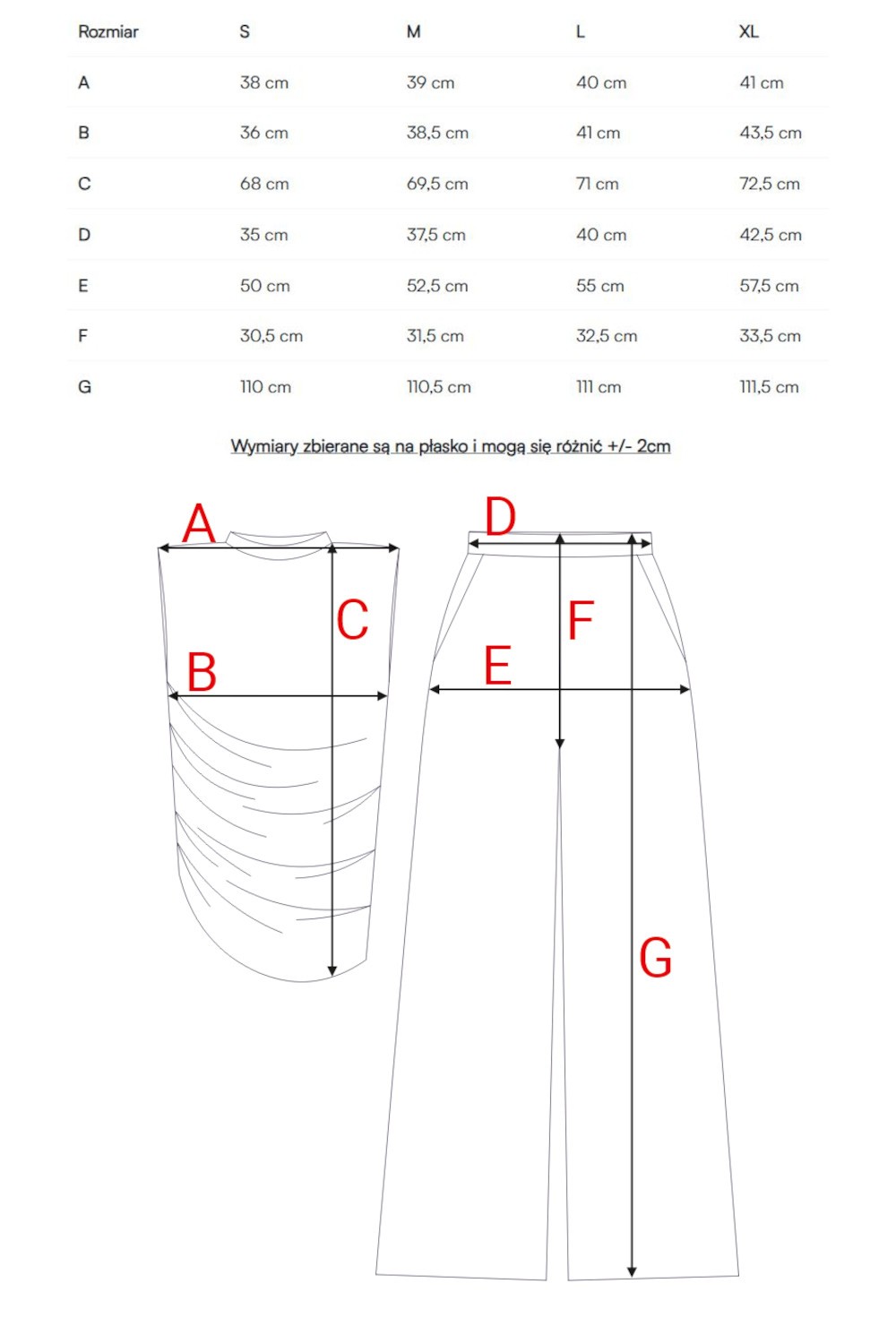 • Spodnie: długie, z szerokimi nogawkami, zakładki przy pasku, luźny krój zapewniający swobodę ruchu