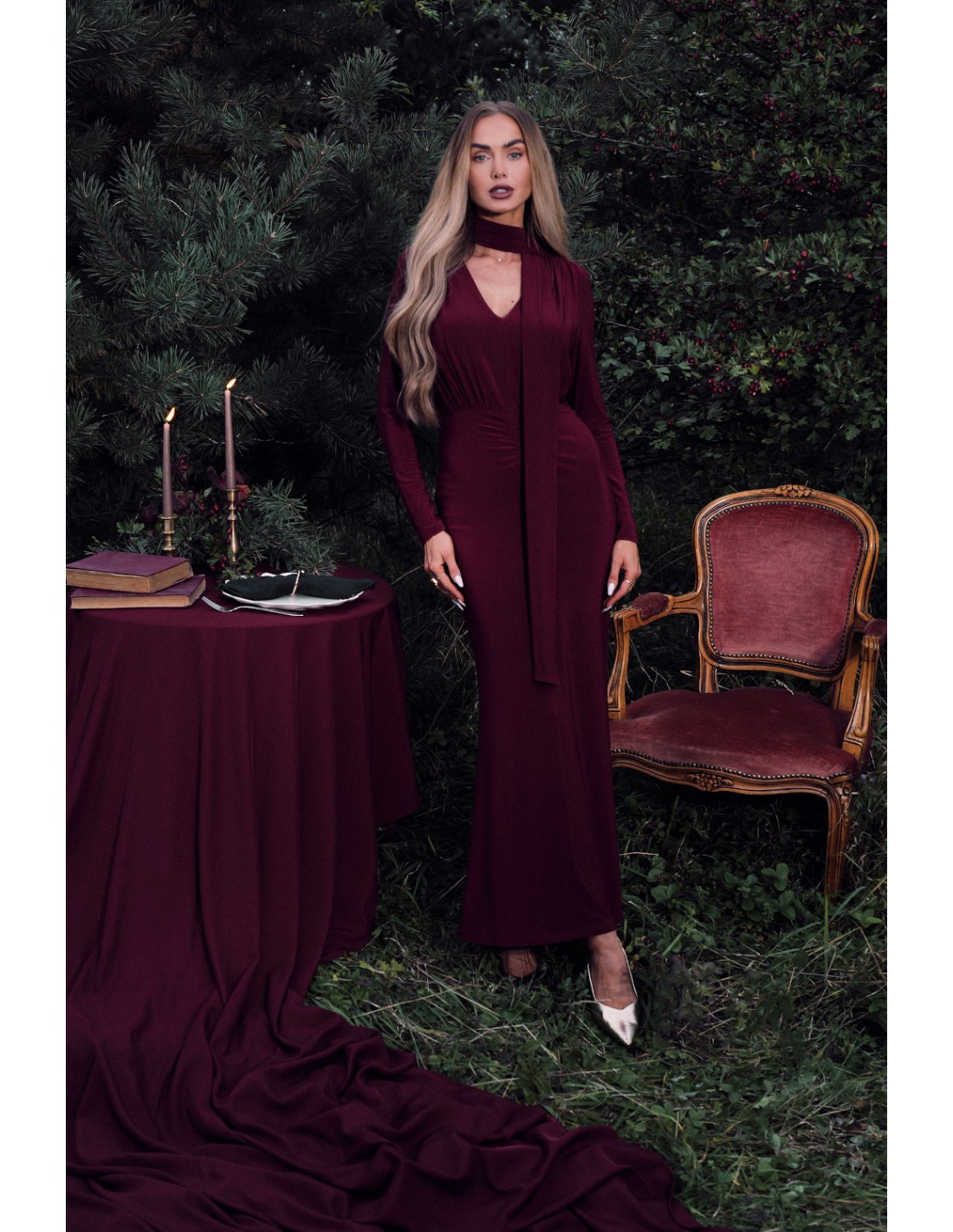 Elegancka sukienka maxi z szarfą - bordowa