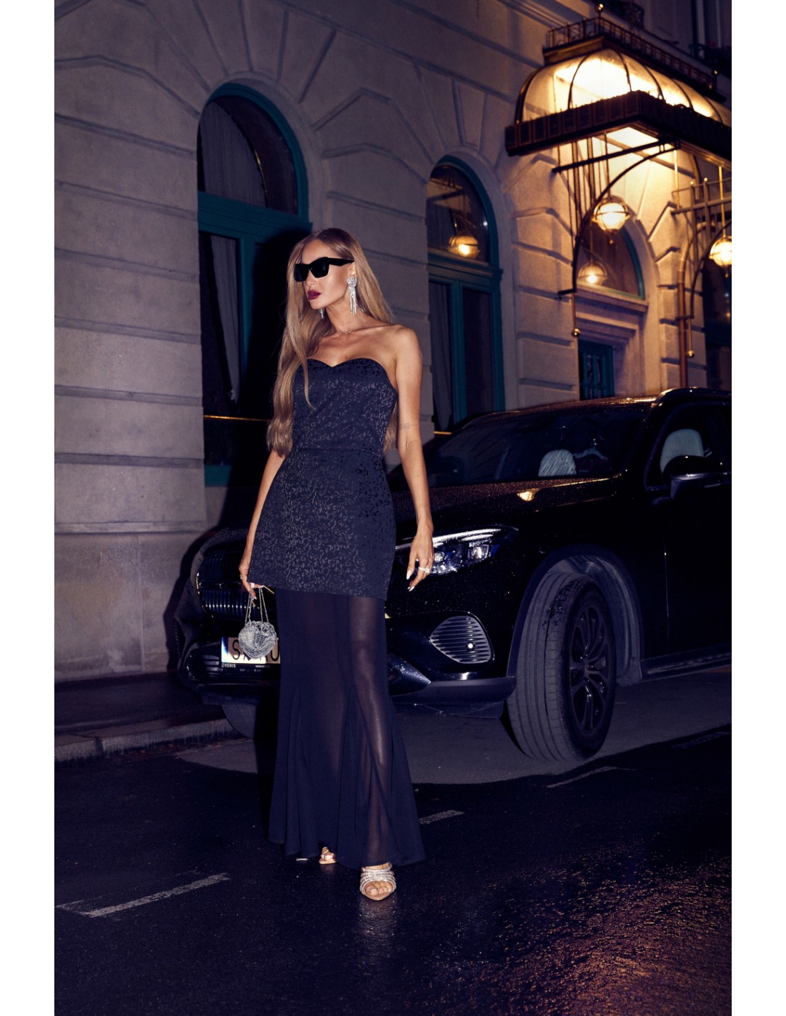• Fason: dwuczęściowa sukienka – gorsetowa mini z dopasowaną górą + długa szyfonowa spódnica