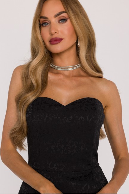 • Materiał: tkanina żakardowa z subtelnym tłoczonym wzorem (gorset) oraz lekka, zwiewna tkanina szyfonowa (spódnica)