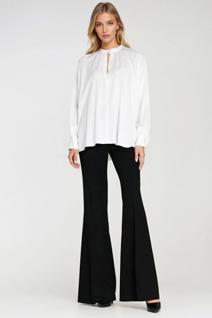 Klasyczne spodnie damskie typu dzwony to elegancka propozycja dla kobiet ceniących ponadczasowy styl i wygodę. Fason z kantem optycznie wydłuża nogi, nadając sylwetce smukłości i lekkości. Wysoki stan pięknie podkreśla talię, a dopasowana linia bioder harmonijnie przechodzi w rozszerzaną nogawkę, tworząc efektowną, kobiecą formę. Spodnie świetnie sprawdzą się w stylizacjach biurowych, wizytowych i codziennych — w połączeniu z koszulą, marynarką lub dopasowanym golfem.