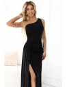 DM1524 Błyszcząca sukienka na jedno ramię z rozcięciem na nogę - czarna