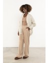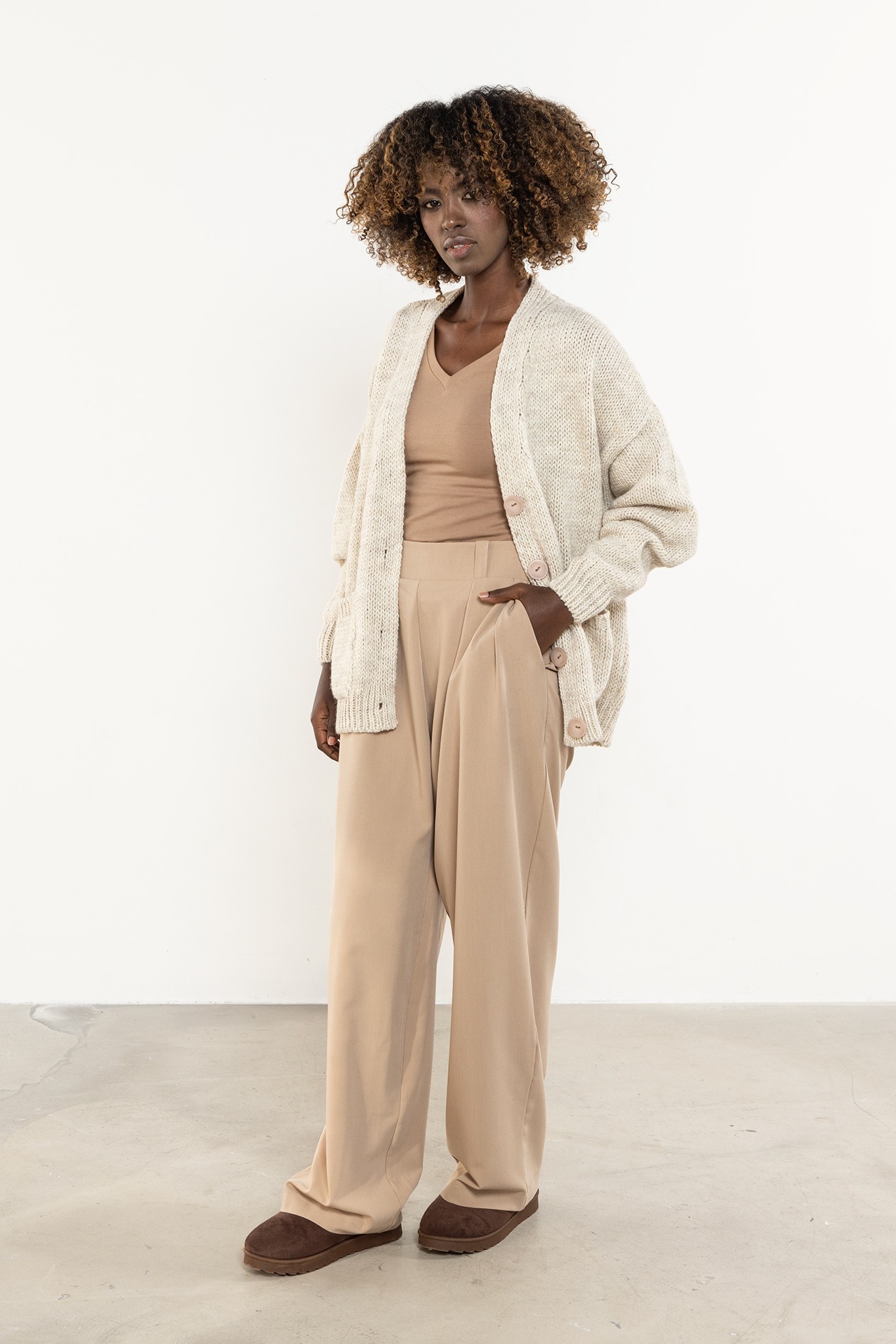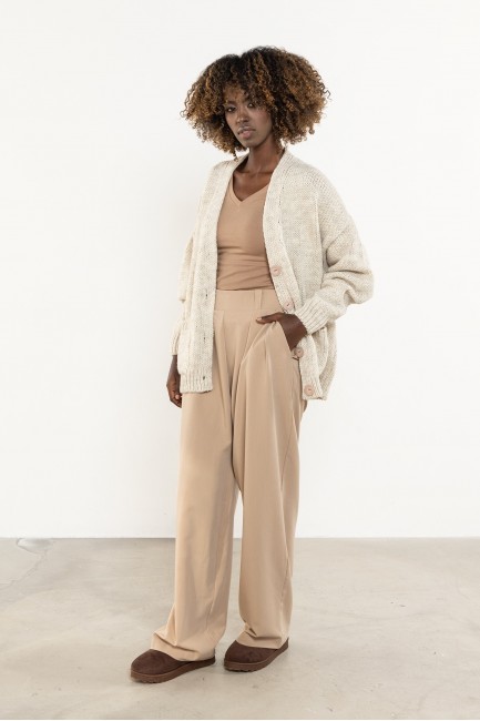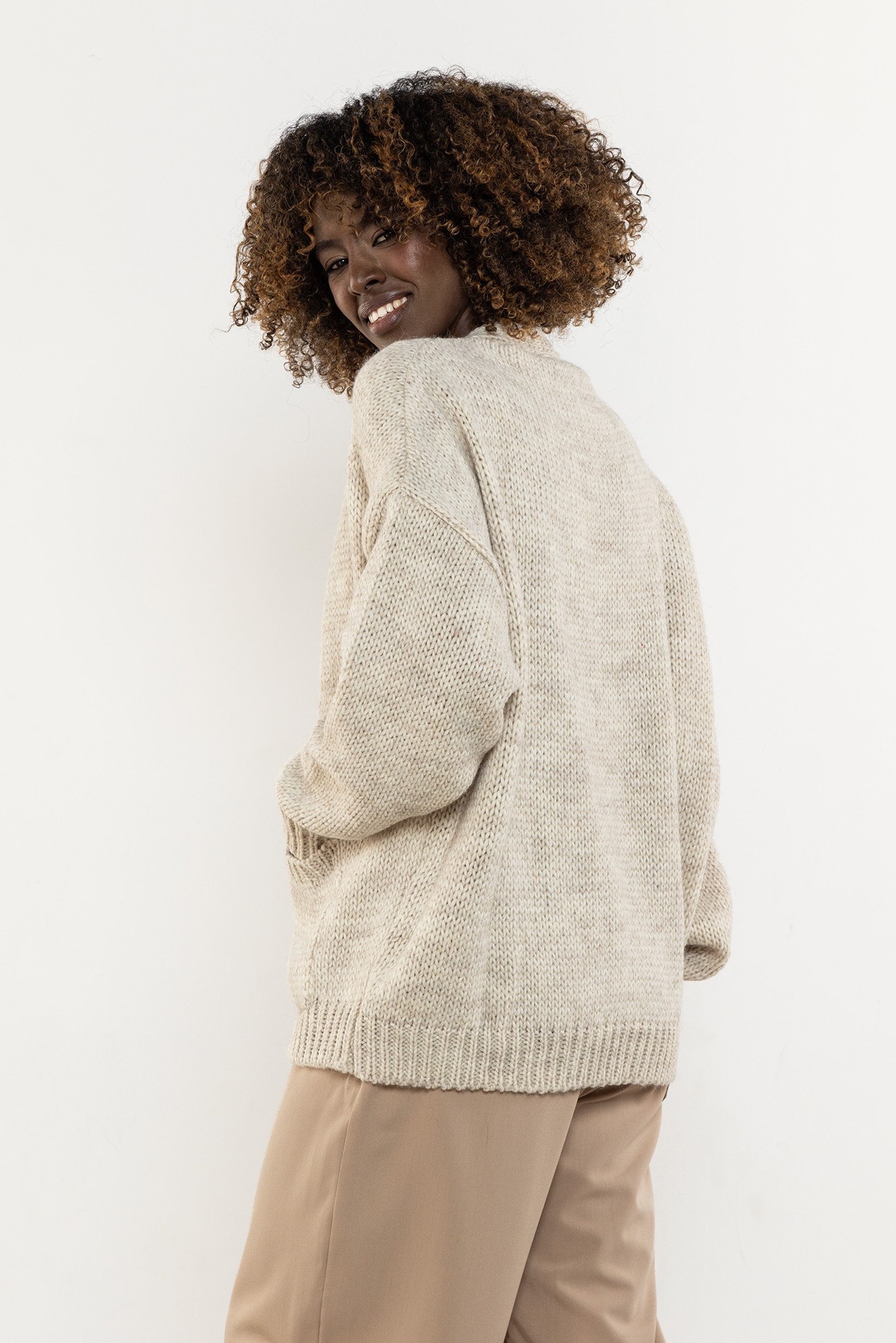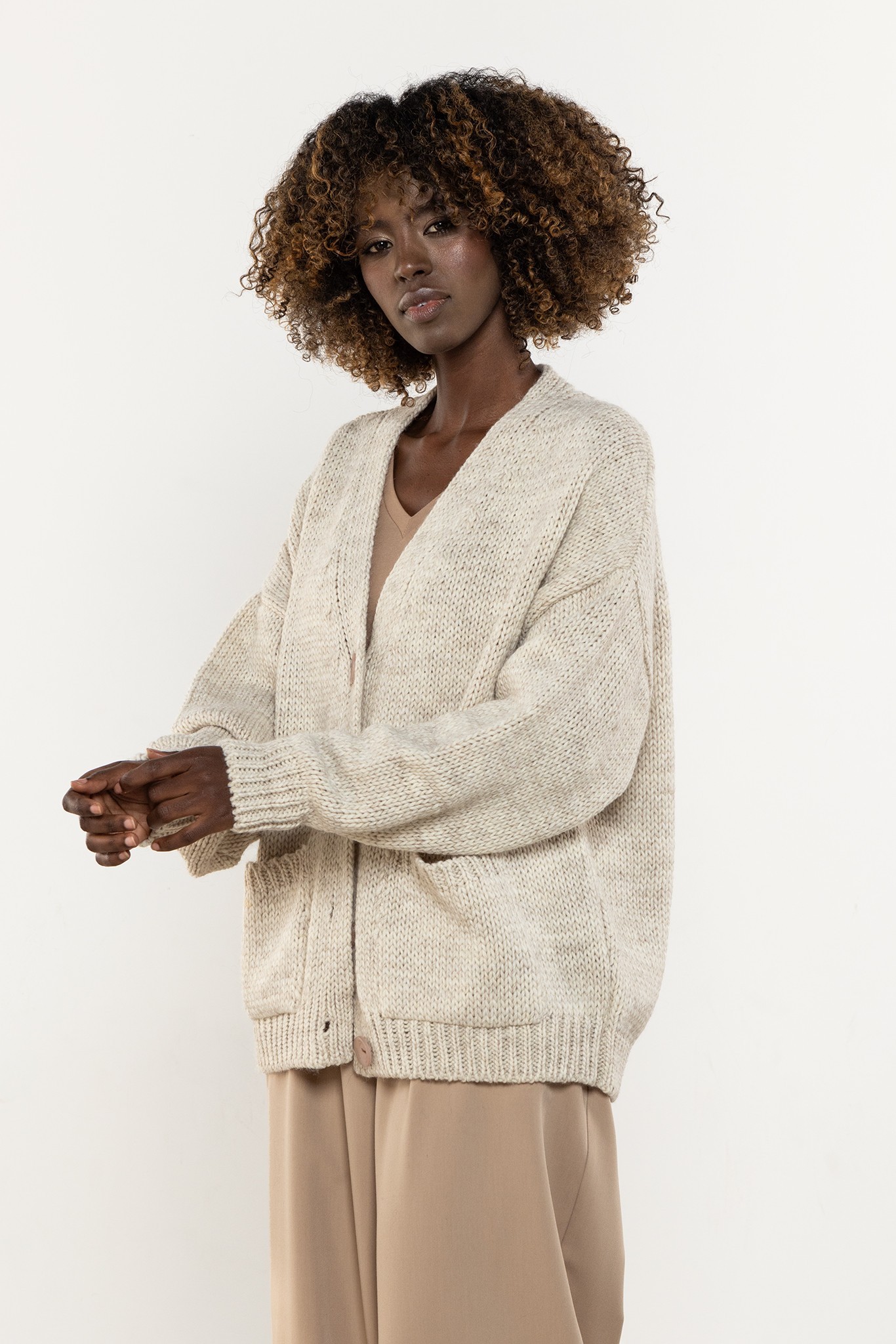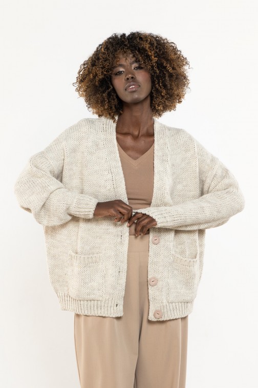 Damski kardigan zapinany na guziki to miękki, praktyczny basic w stylu oversize — idealny zarówno do codziennych, jak i biurowych stylizacji. Luźny krój z obniżoną linią ramion zapewnia swobodę i komfort, a dekolt w kształcie litery V subtelnie wysmukla sylwetkę i ułatwia tworzenie warstwowych zestawów. Wyrazisty dzianinowy splot oraz prążkowane wykończenia mankietów i dołu podkreślają jakość wykonania, dzięki czemu model stanowi ponadczasowy element garderoby kapsułowej. Sweter można nosić na wiele sposobów — rozpięty jako lekką narzutkę lub zapięty zamiast klasycznego swetra. Długość sięgająca bioder zapewnia odpowiednie proporcje i wygodę noszenia przez cały dzień. To niezawodna propozycja do pracy, na uczelnię i weekendowe wyjścia.