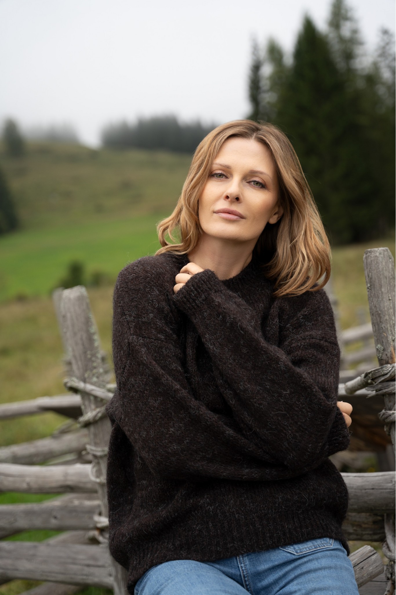 Miękki sweter z domieszką kid moheru to puchaty basic, który otula ciepłem i dodaje przytulności każdej stylizacji. Prosty, swobodny krój z obniżoną linią ramion zapewnia komfort i lekkość, a delikatnie puszysta dzianina nadaje mu wyjątkowo miękki charakter. Okrągły dekolt oraz lekko bufiaste rękawy podkreślają nowoczesny, „relaxed” styl, idealny na co dzień, do biura lub na weekendowy wyjazd. Wyraźne, prążkowane ściągacze przy mankietach i u dołu utrzymują fason i chronią przed chłodem. Długość lekko zakrywająca biodra sprawia, że sweter doskonale współgra z jeansami, spodniami z wyższym stanem lub satynową spódnicą. Minimalistyczny design czyni go wszechstronnym elementem kapsułowej garderoby.