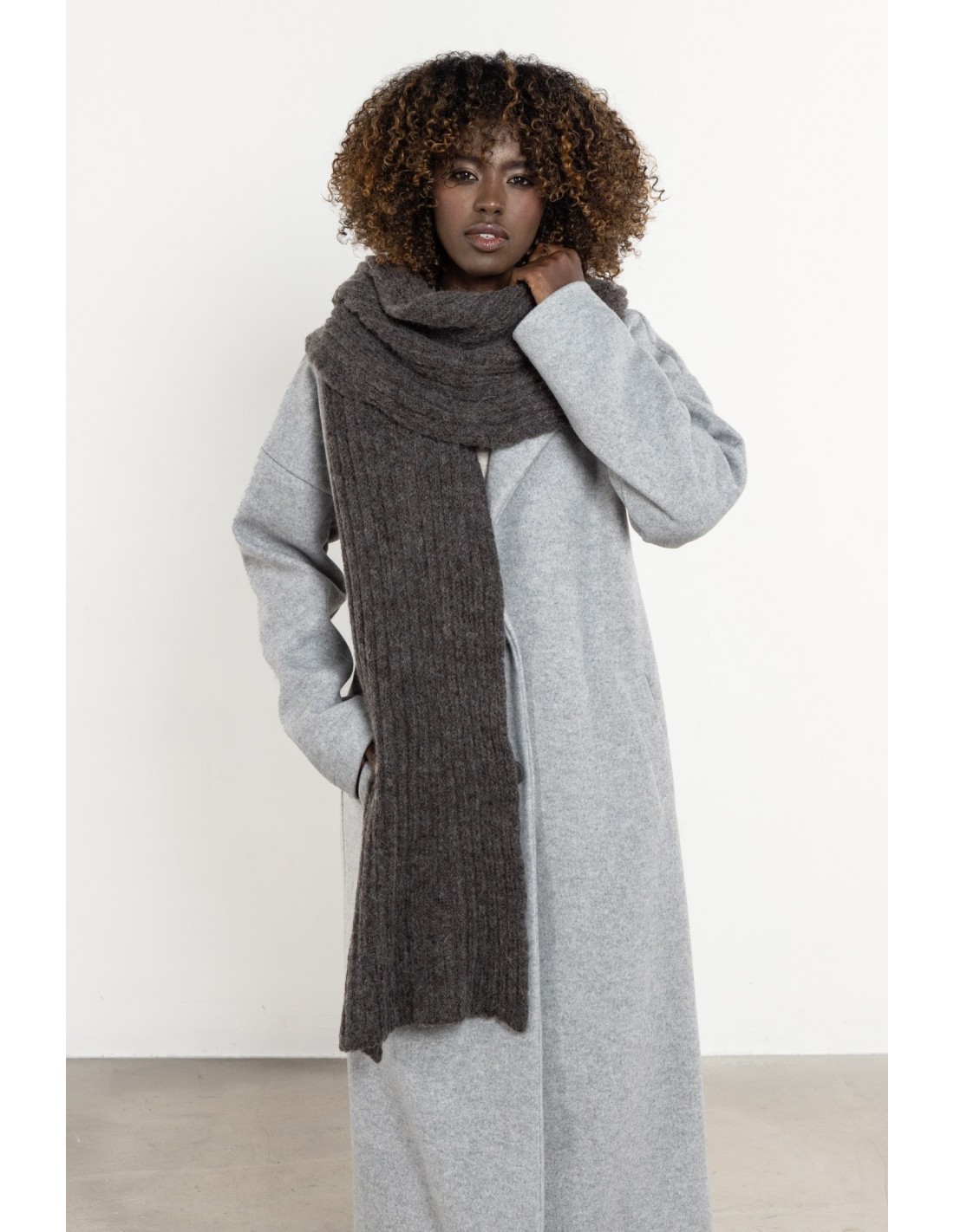 Długi, puszysty szalik z domieszką moheru to otulający dodatek, który łączy ciepło, miękkość i elegancję. Wykonany z przyjemnej w dotyku dzianiny o sprężystym splocie, skutecznie chroni przed chłodem i wiatrem, pozostając lekki oraz delikatny dla skóry. Jego ponadczasowy, minimalistyczny design sprawia, że doskonale komponuje się zarówno z płaszczem, jak i puchową kurtką. Szalik można nosić na wiele sposobów — owinięty wokół szyi, związany w węzeł francuski lub zarzucony na ramiona jak szal. Prążkowana faktura dodaje mu objętości i przytulnego charakteru, a staranne wykończenia na brzegach zapobiegają strzępieniu. To niezbędny element zimowej garderoby, który łączy funkcjonalność z ponadczasowym stylem.