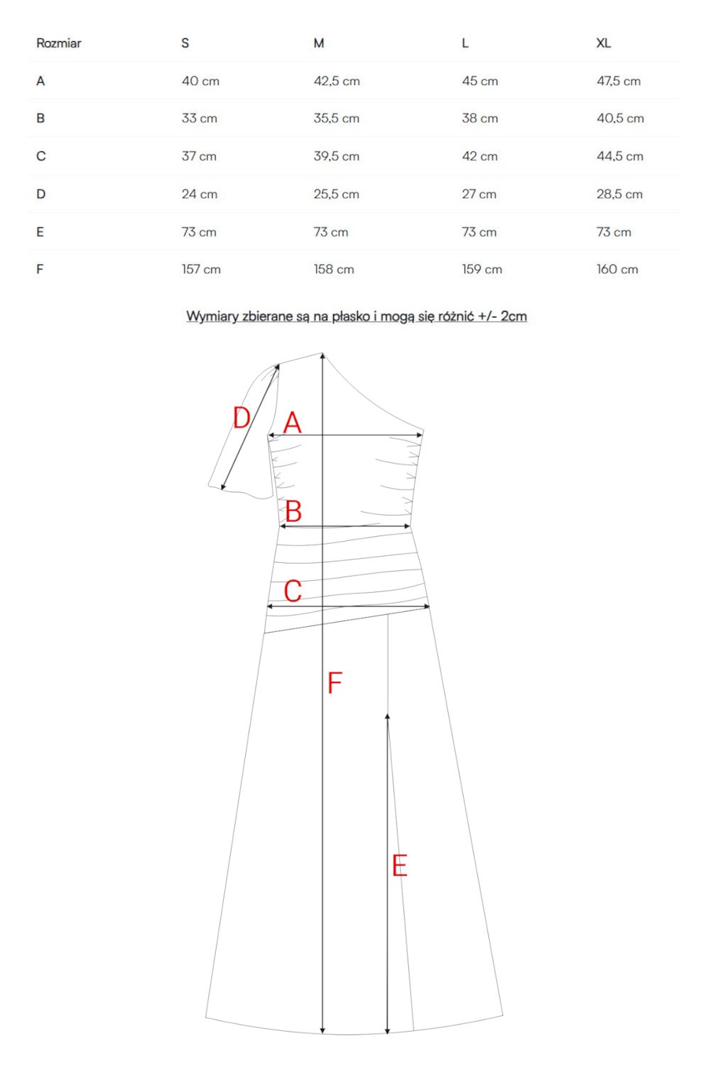 Zmysłowa suknia maxi na jedno ramię to propozycja, która łączy nowoczesną elegancję z efektownym, asymetrycznym wykończeniem. Wykonana z miękkiej, elastycznej i lejącej dzianiny, pięknie dopasowuje się do sylwetki, podkreślając jej linię bez krępowania ruchów. Asymetryczny dekolt odsłania jedno ramię, dodając całości wyjątkowego charakteru, a liczne marszczenia po bokach subtelnie modelują figurę. Długi dół z wysokim rozcięciem efektownie eksponuje nogę, tworząc wyrazisty, wieczorowy look.