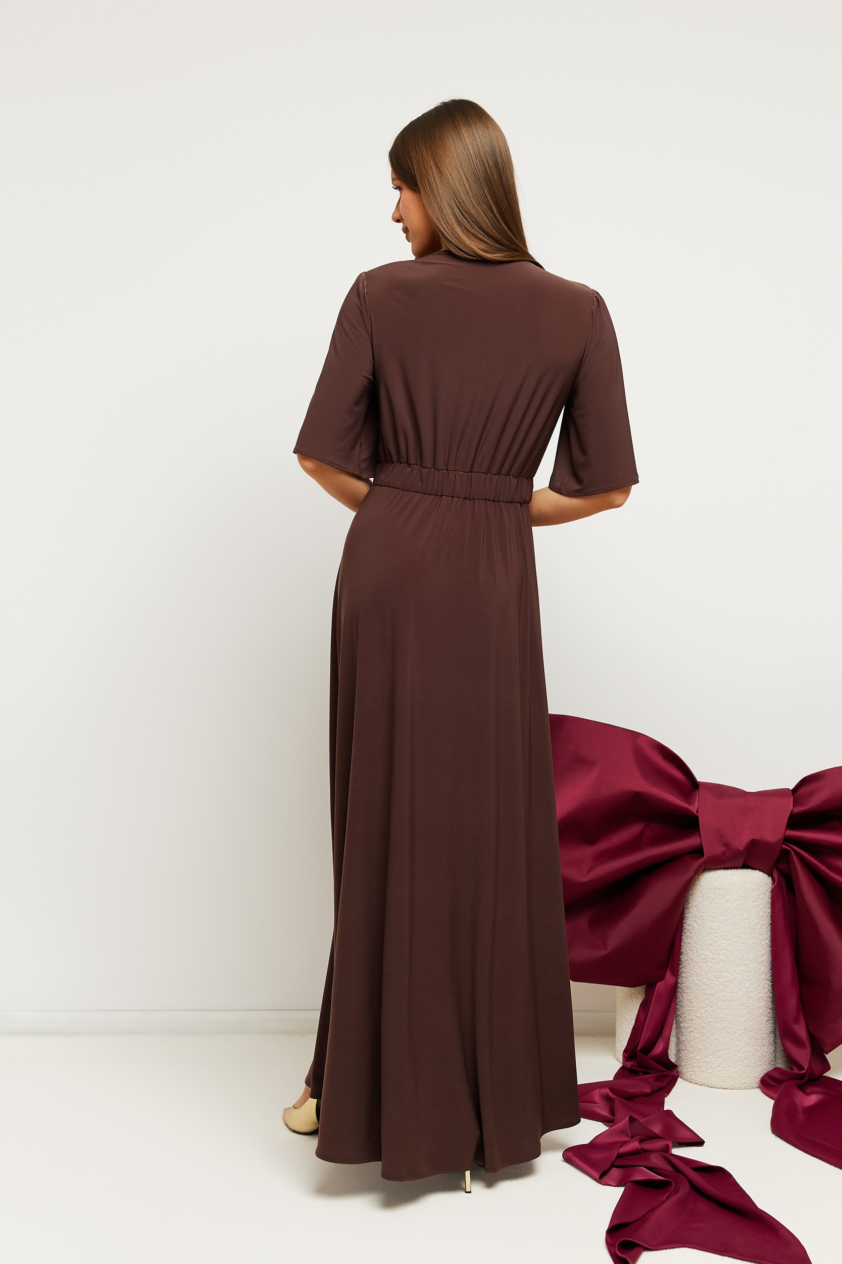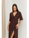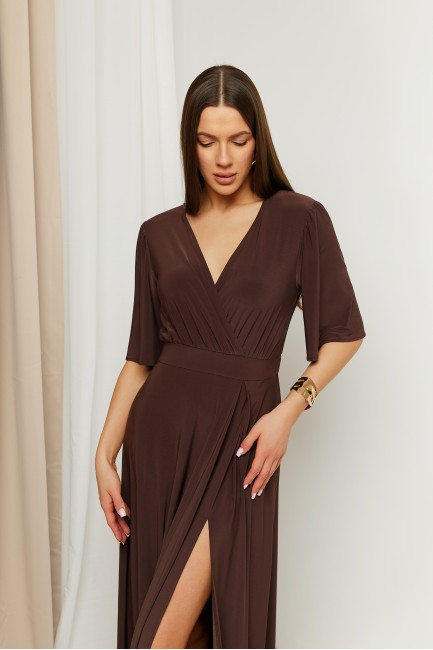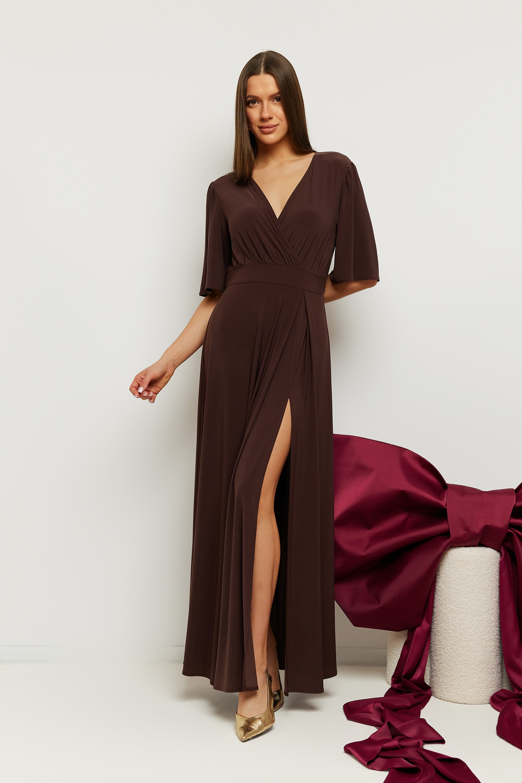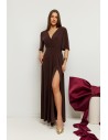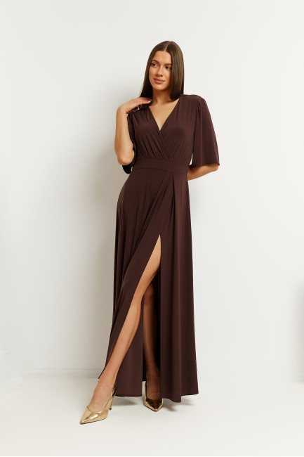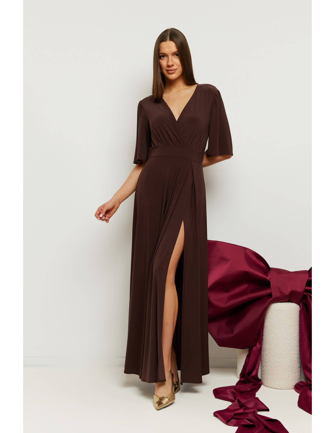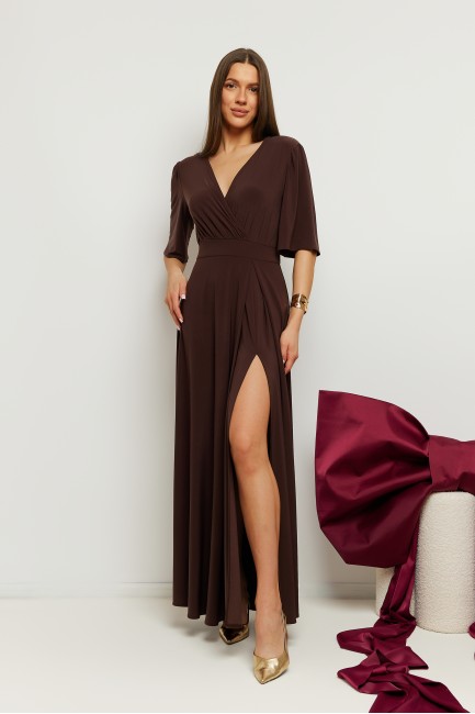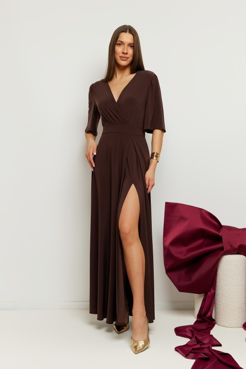 Sukienka wieczorowa z wysokim rozcięciem na nogę - brązowa