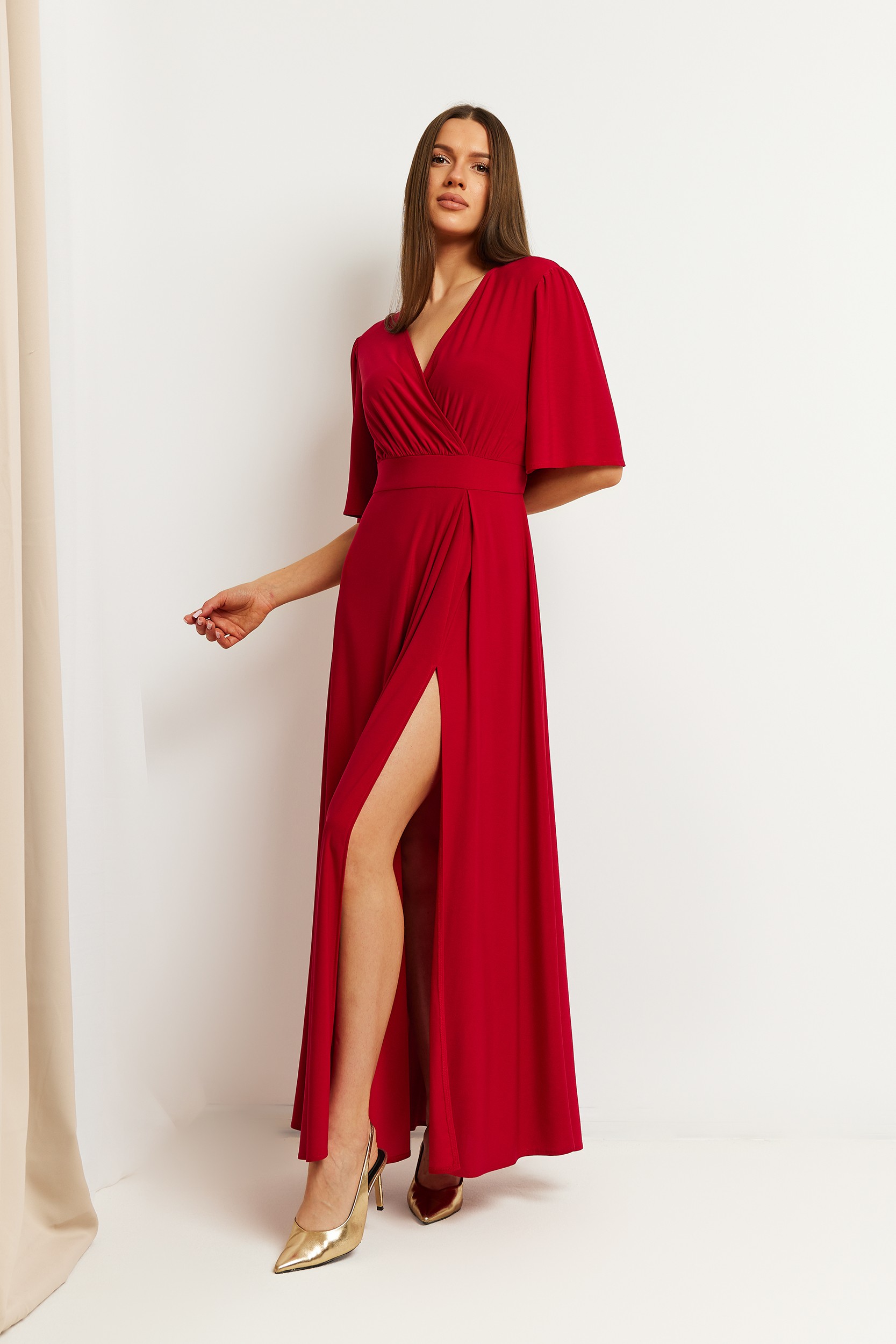 Zmysłowa, zwiewna suknia maxi z kopertowym dekoltem to połączenie elegancji i kobiecej lekkości. Wykonana z miękkiej, elastycznej dzianiny, pięknie dopasowuje się do sylwetki i komfortowo układa w ruchu. Góra typu kopertowego tworzy dekolt w kształcie litery V, który wysmukla szyję i subtelnie eksponuje obojczyki. Krótkie rękawki typu „motylek” dodają sukience romantycznego charakteru, a szeroki pas wyraźnie podkreśla talię. Długi, swobodny dół z wysokim rozcięciem na nogę nadaje stylizacji lekkości i nowoczesnego pazura.