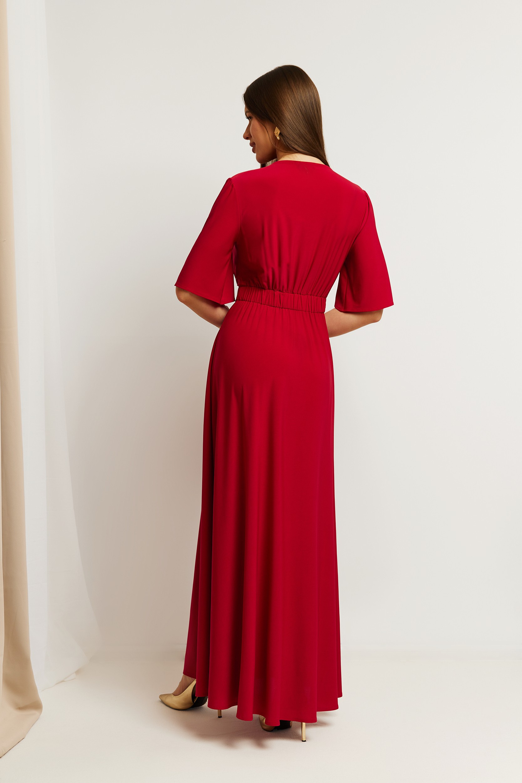 • Fason: zwiewna sukienka maxi o linii A z kopertową górą