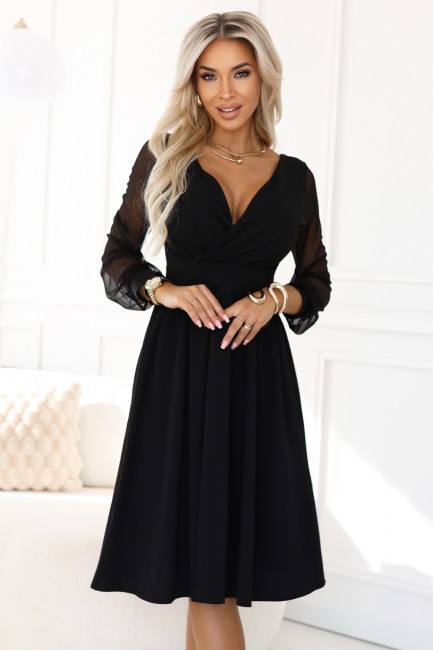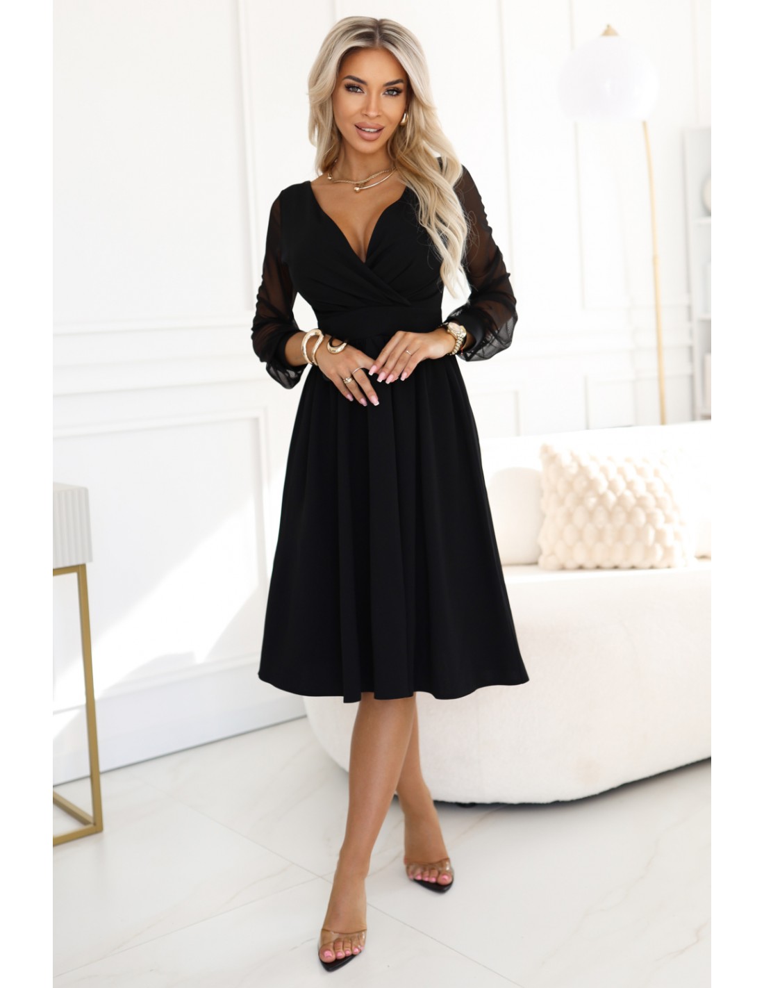 DM1549 Elegancka sukienka midi z tiulowymi rękawami - czarna