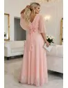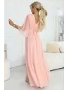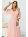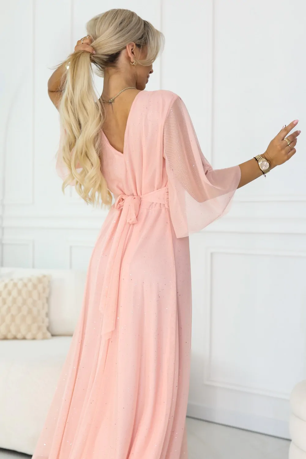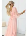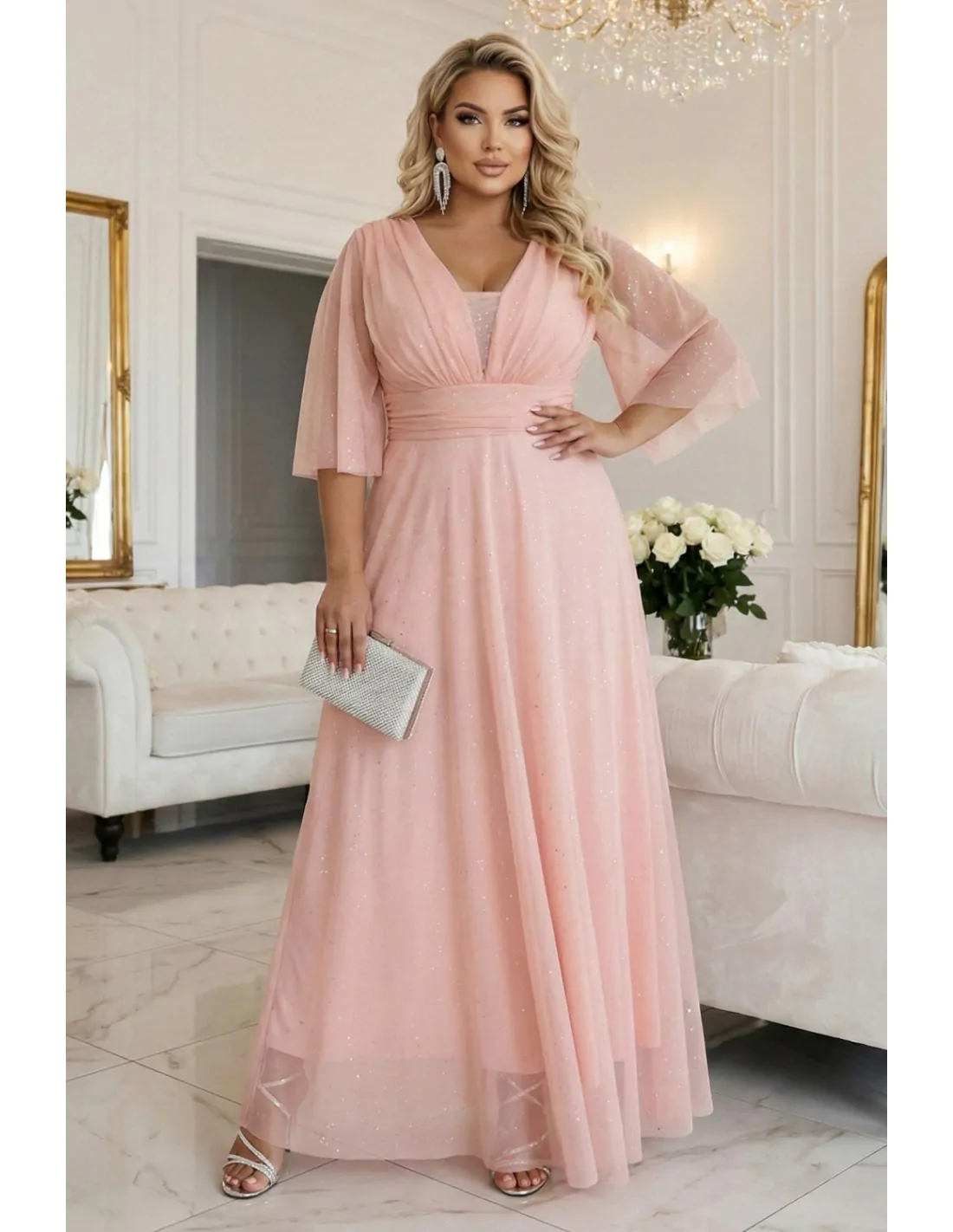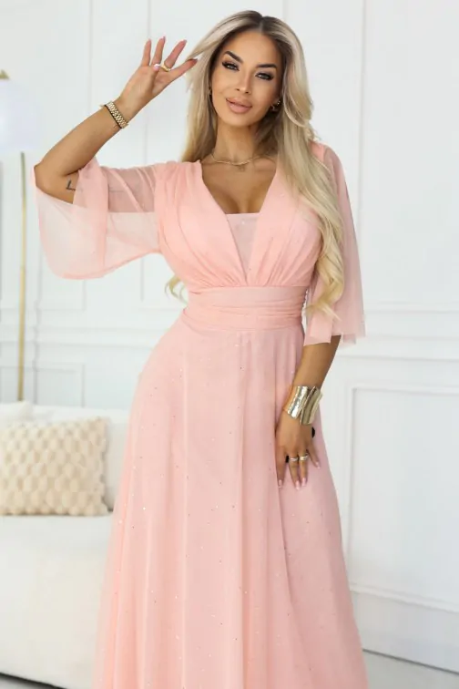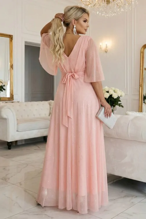 DM1557 Długa połyskująca sukienka z dekoltem - brzoskwiniowa