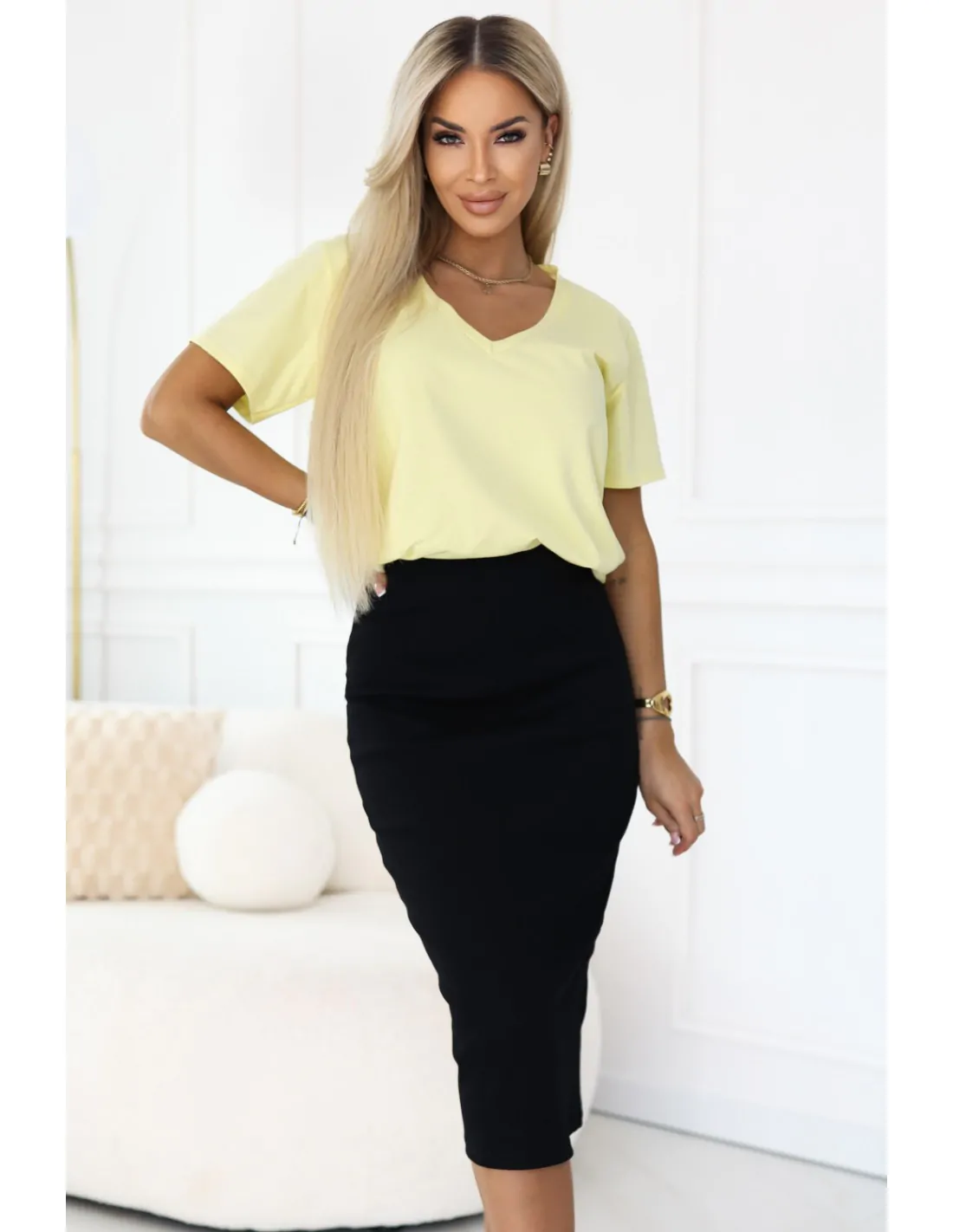 Bawełniana bluzka damska z dekoltem V - żółta