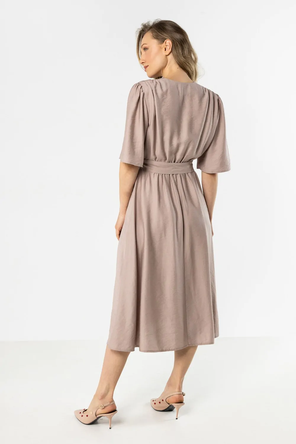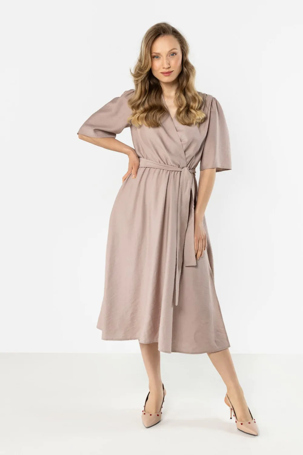 Elegancka sukienka kopertowa midi z wiązaniem w talii to doskonałe połączenie klasyki i kobiecego stylu. Kopertowy dekolt w kształcie litery V subtelnie podkreśla szyję i dekolt, a wiązanie w talii pozwala idealnie dopasować sukienkę do sylwetki, akcentując jej atuty. Długość midi dodaje całości elegancji i sprawia, że model świetnie sprawdzi się zarówno podczas spotkań biznesowych, uroczystości rodzinnych, jak i eleganckich wyjść. Wykonana z przyjemnej w dotyku tkaniny, zapewnia komfort noszenia przez cały dzień.