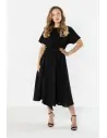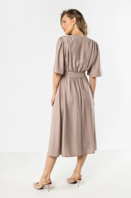 Elegancka sukienka kopertowa midi z wiązaniem w talii to doskonałe połączenie klasyki i kobiecego stylu. Kopertowy dekolt w kształcie litery V subtelnie podkreśla szyję i dekolt, a wiązanie w talii pozwala idealnie dopasować sukienkę do sylwetki, akcentując jej atuty. Długość midi dodaje całości elegancji i sprawia, że model świetnie sprawdzi się zarówno podczas spotkań biznesowych, uroczystości rodzinnych, jak i eleganckich wyjść. Wykonana z przyjemnej w dotyku tkaniny, zapewnia komfort noszenia przez cały dzień.