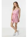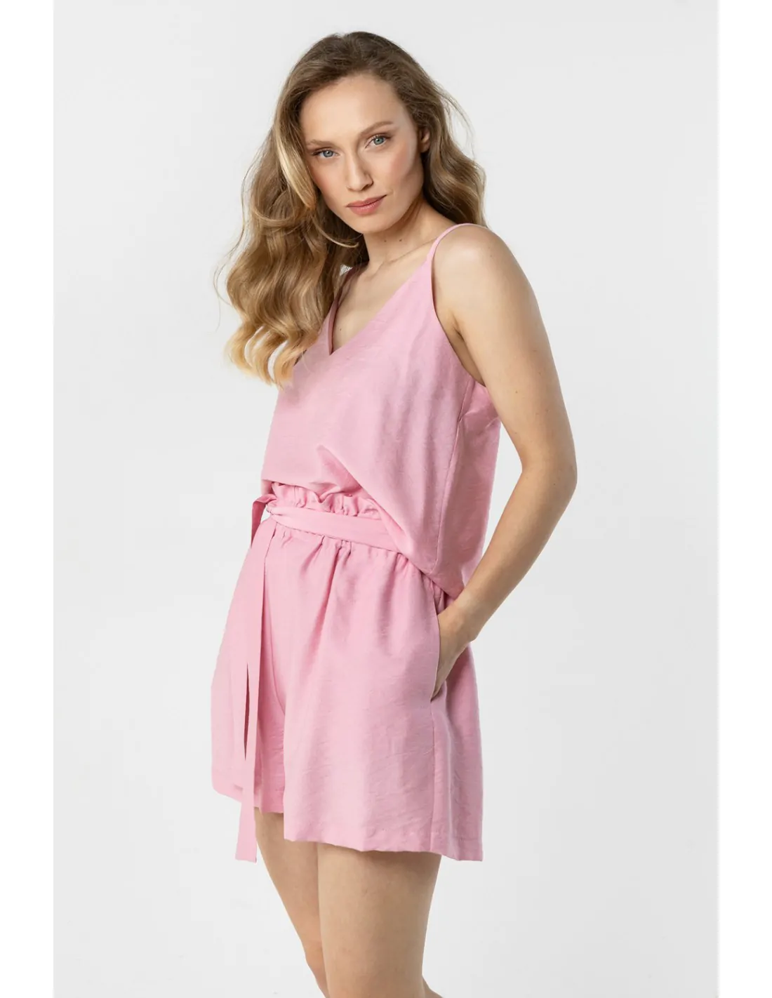 Lekkie szorty z wysokim stanem i wiązaniem w talii to idealna propozycja na ciepłe, letnie dni. Swobodny fason zapewnia komfort noszenia i pełną swobodę ruchów, a wysoki stan z marszczoną talią pięknie podkreśla sylwetkę. Wiązanie w pasie dodaje całości kobiecego charakteru i pozwala lepiej dopasować model do figury. Luźniejsze nogawki gwarantują wygodę, a praktyczne kieszenie po bokach zwiększają funkcjonalność. Szorty doskonale sprawdzą się w codziennych, letnich stylizacjach, łącząc styl i wygodę.