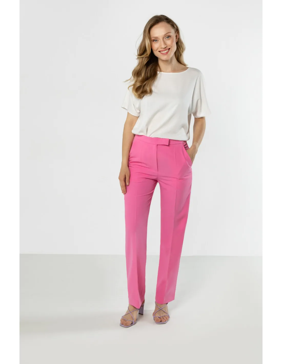Eleganckie spodnie z prostą nogawką i wysokim stanem - różowe