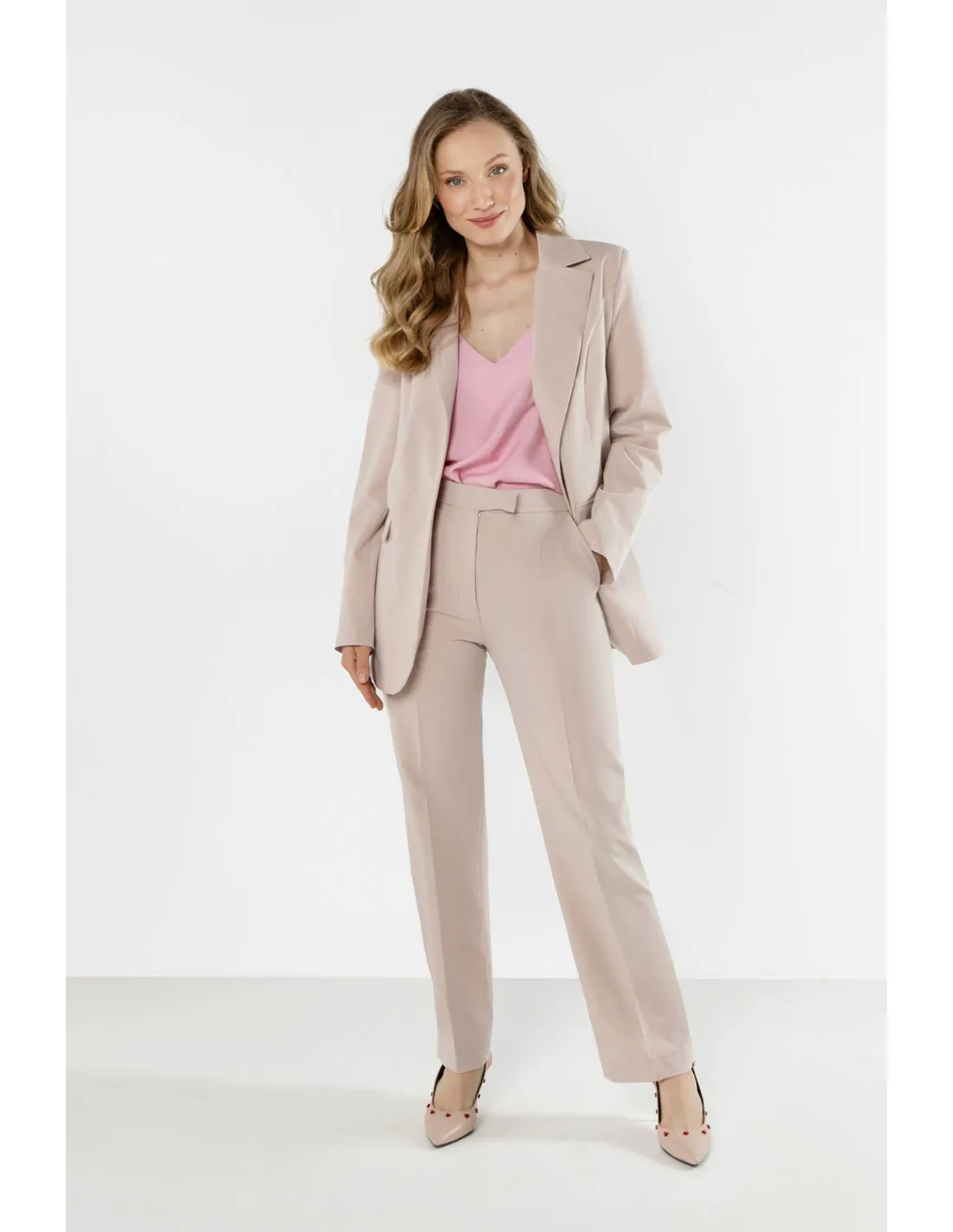 Elegancka marynarka jednorzędowa z klapami to ponadczasowy element garderoby, który doskonale uzupełnia zarówno formalne, jak i bardziej nowoczesne stylizacje. Klasyczny, jednorzędowy fason z klapami pięknie układa się na sylwetce i nadaje całości eleganckiego charakteru. Delikatnie taliowany krój podkreśla kobiecą linię, zapewniając jednocześnie komfort noszenia. Gładki materiał oraz staranne wykończenie sprawiają, że marynarka prezentuje się niezwykle stylowo i schludnie. Model świetnie wygląda w komplecie ze spodniami, ale równie dobrze sprawdzi się w zestawieniu z jeansami lub sukienką.