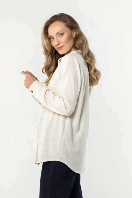 Lniana koszula z kołnierzykiem i długim rękawem to ponadczasowy element garderoby, który doskonale sprawdzi się w cieplejsze dni. Wykonana z naturalnej tkaniny lnianej zapewnia przewiewność, lekkość i wysoki komfort noszenia. Swobodny fason miękko układa się na sylwetce, gwarantując wygodę przez cały dzień. Klasyczny kołnierzyk oraz zapięcie na guziki nadają koszuli uniwersalnego charakteru, dzięki czemu model pasuje zarówno do codziennych, jak i bardziej eleganckich stylizacji. Długi rękaw zakończony mankietem dodaje całości stylowego wykończenia.