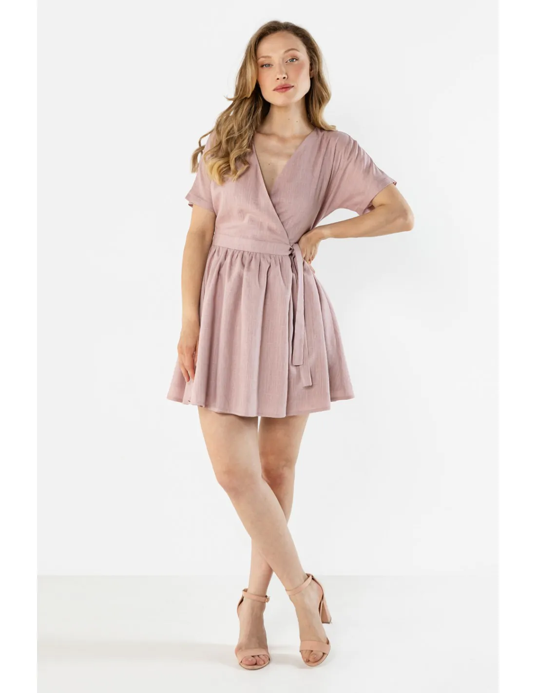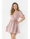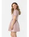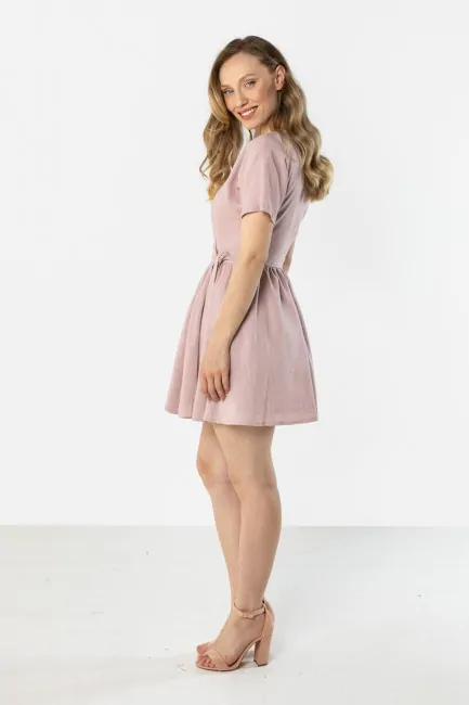 DM1578 Lniana sukienka kopertowa mini z wiązaniem - brudny róż