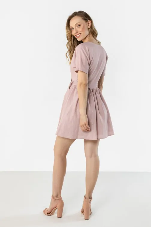 Lniana sukienka kopertowa mini z wiązaniem - brudny róż
