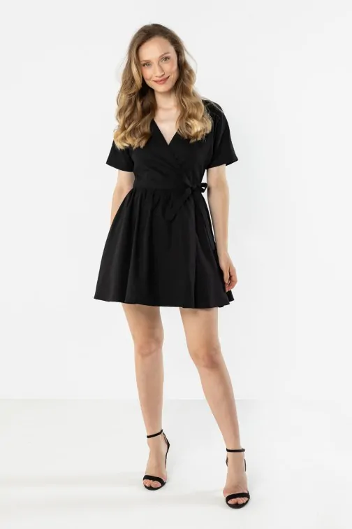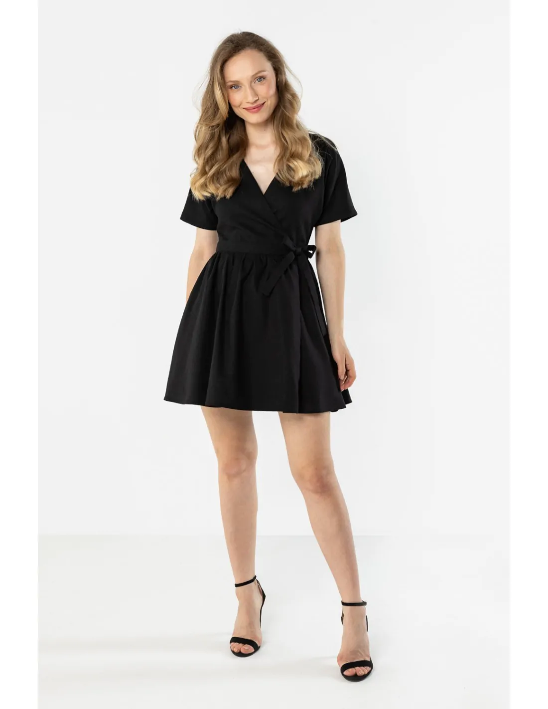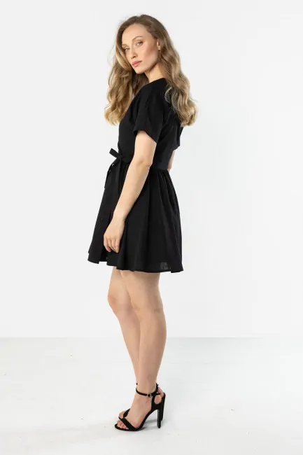 DM1578 Lniana sukienka kopertowa mini z wiązaniem - czarna