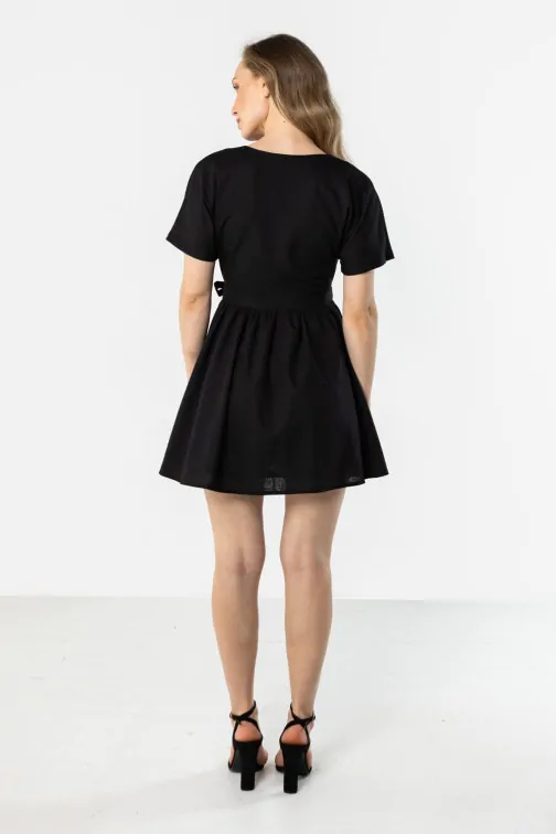 Lniana sukienka kopertowa mini z wiązaniem - czarna