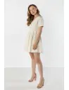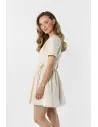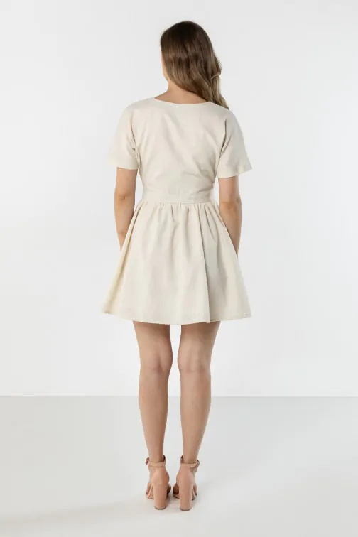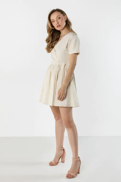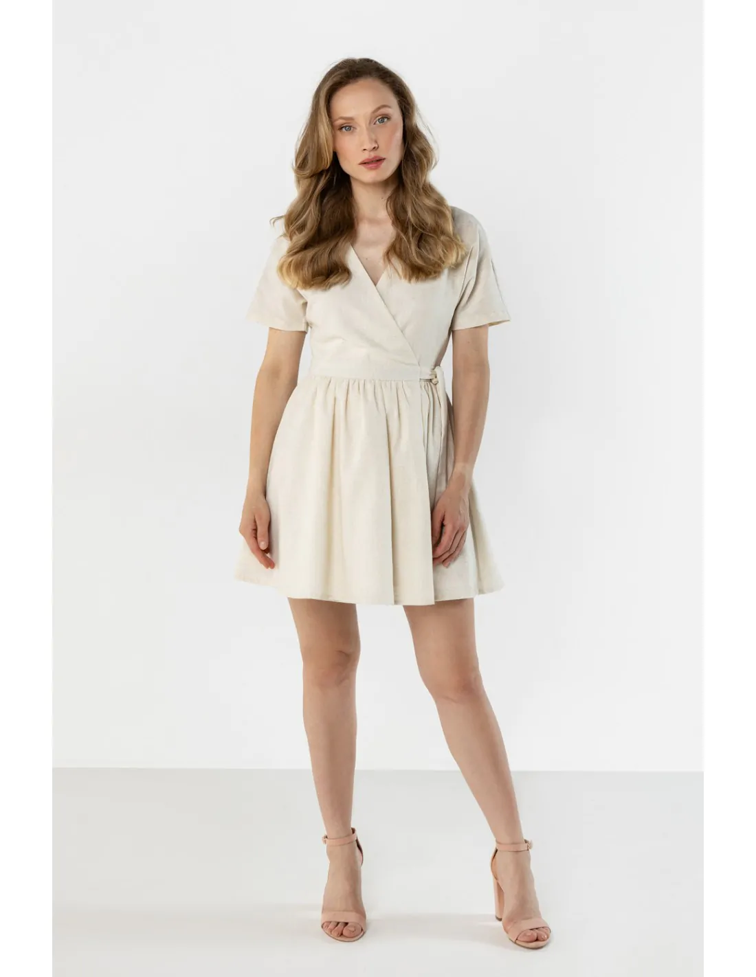 Lniana sukienka mini kopertowa z wiązaniem w talii to lekki i kobiecy model idealny na ciepłe dni. Kopertowy fason z dekoltem w kształcie litery V subtelnie podkreśla szyję oraz dekolt, nadając stylizacji eleganckiego charakteru. Wiązanie w talii pozwala idealnie dopasować sukienkę do sylwetki i pięknie ją podkreśla. Krótkie rękawy zapewniają wygodę noszenia, a rozkloszowany dół dodaje całości lekkości i swobody ruchów. Naturalna, lniana tkanina sprawia, że sukienka jest przewiewna i komfortowa, dzięki czemu doskonale sprawdzi się w codziennych oraz letnich stylizacjach.