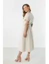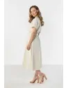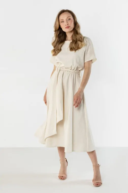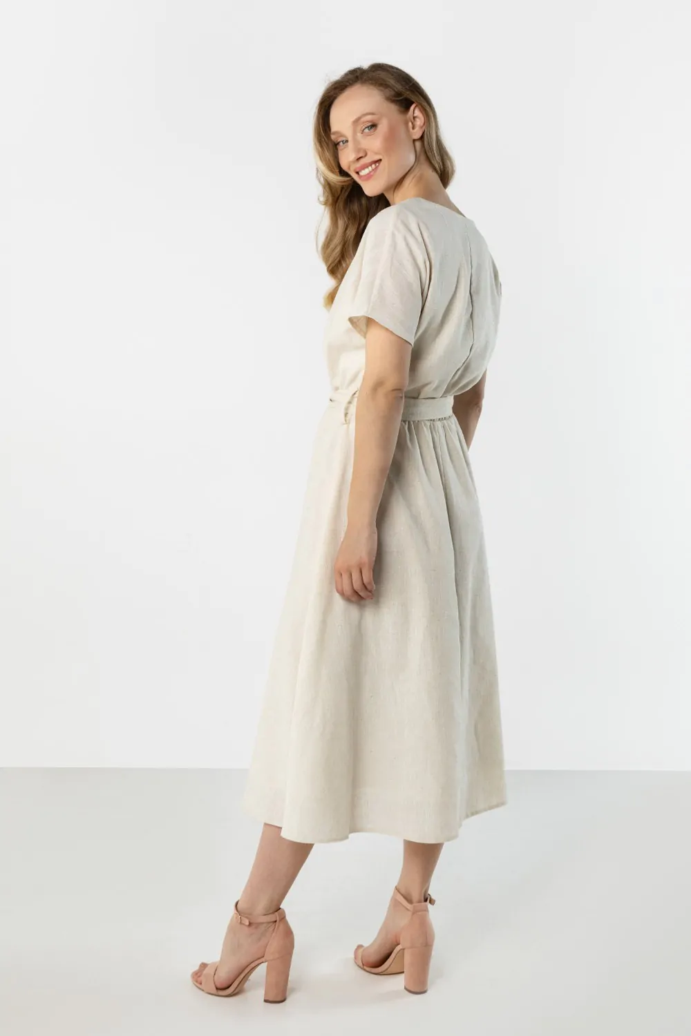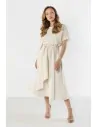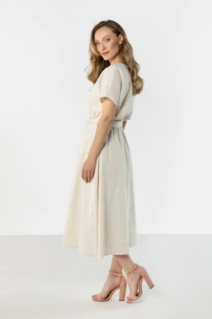 DM1579 Lniana sukienka kopertowa midi z wiązaniem - jasnobeżowa