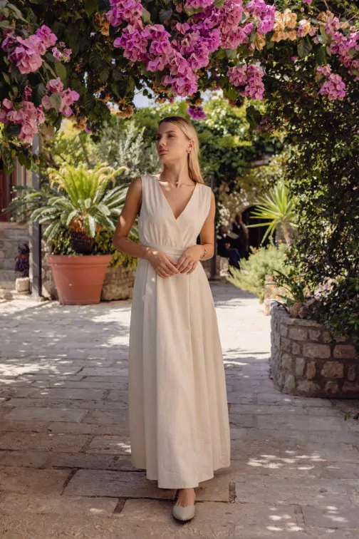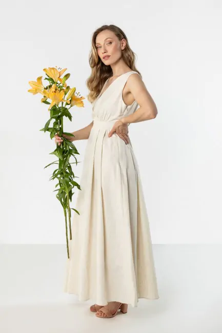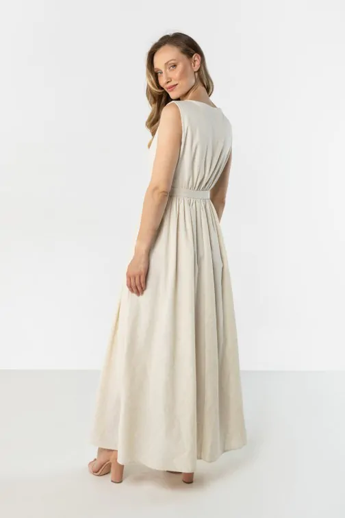 Lniana sukienka maxi z kopertowym dekoltem - jasnobeżowa