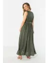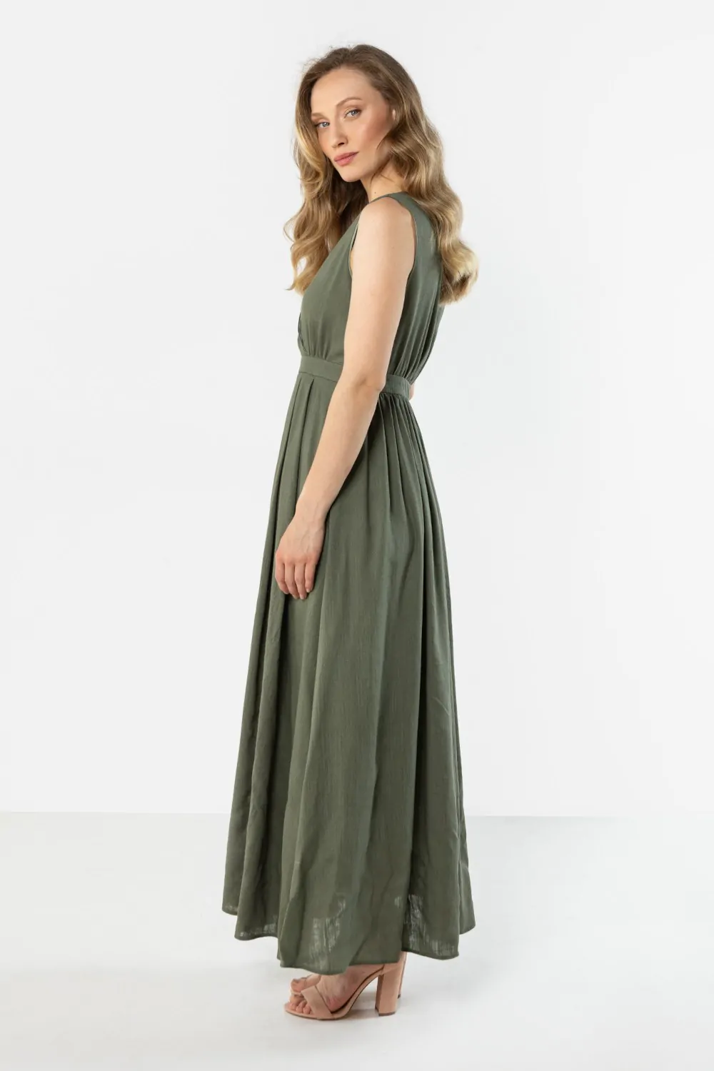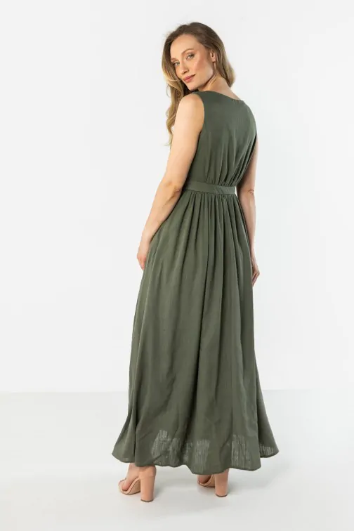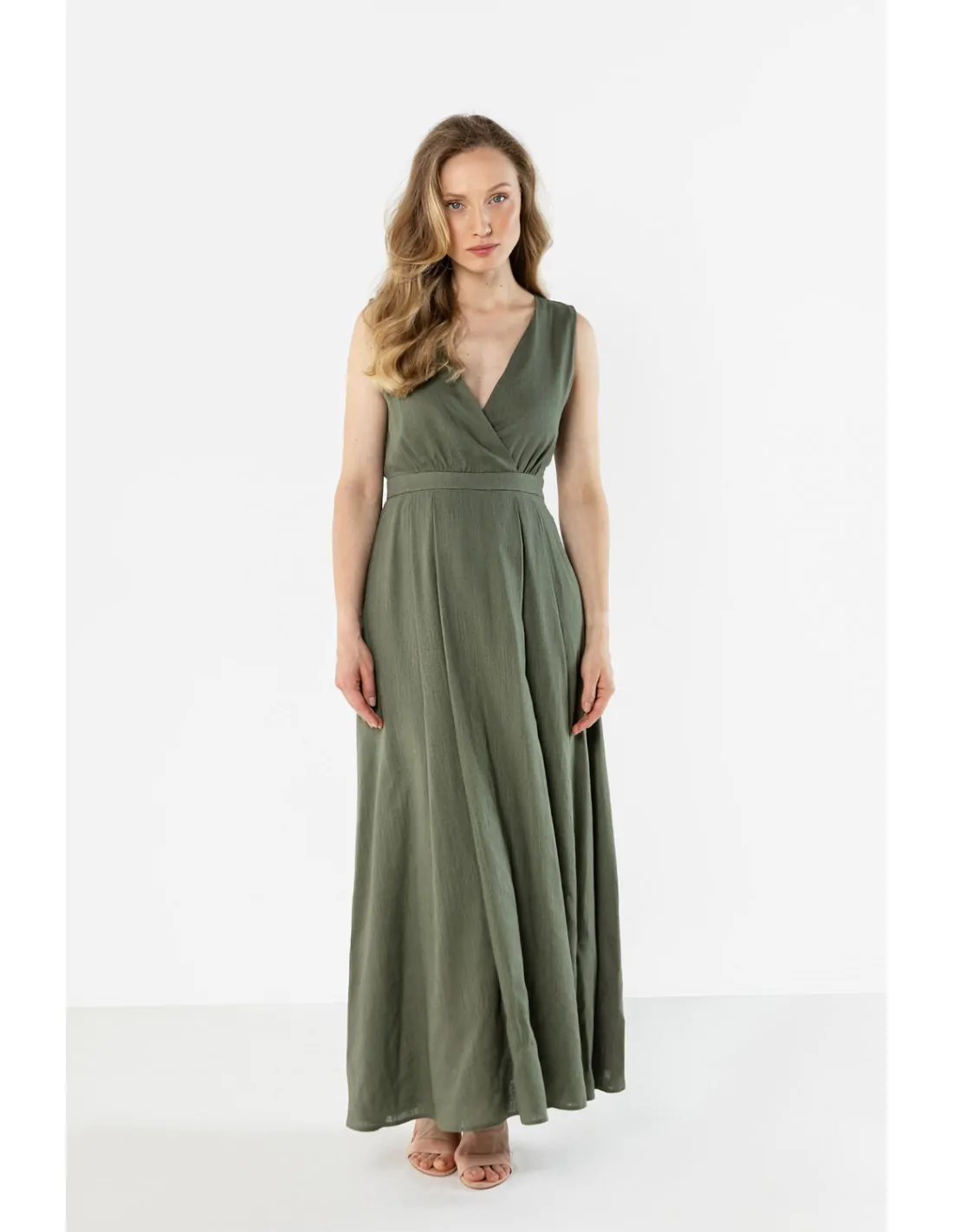 Długa lniana sukienka z kopertowym dekoltem to lekki i elegancki model maxi o ponadczasowym, kobiecym kroju. Kopertowy dekolt w kształcie litery V subtelnie podkreśla szyję i dekolt, a odcięcie w talii delikatnie modeluje sylwetkę. Rozkloszowany dół swobodnie układa się w ruchu, nadając całości lekkości i subtelnej elegancji. Wykonana z naturalnej lnianej tkaniny sukienka zapewnia przewiewność i komfort noszenia, dzięki czemu doskonale sprawdzi się na co dzień, podczas letnich wyjść oraz wakacyjnych okazji.