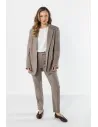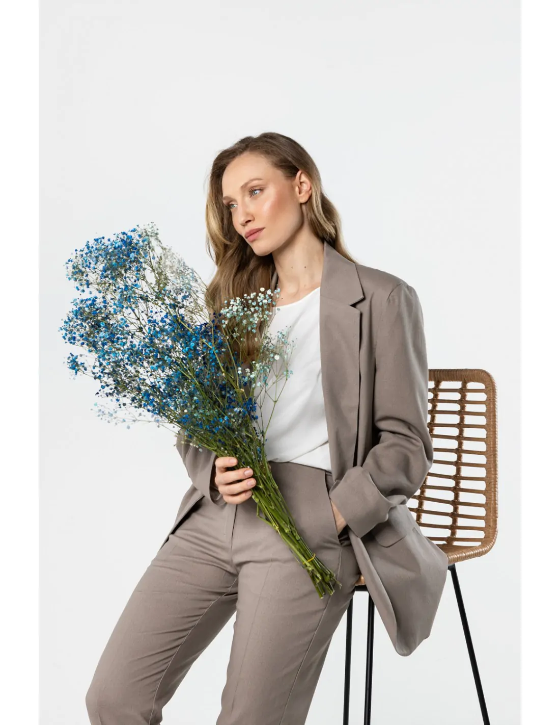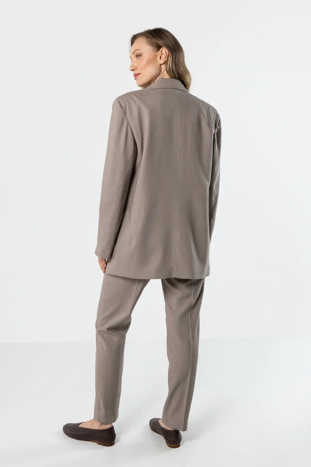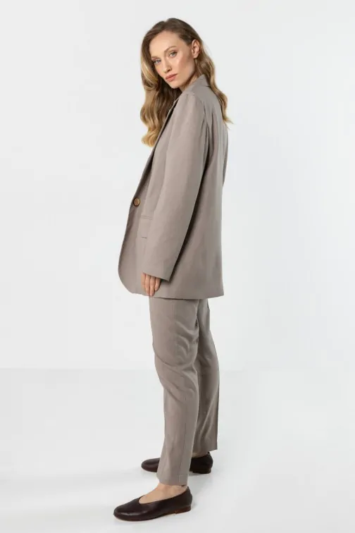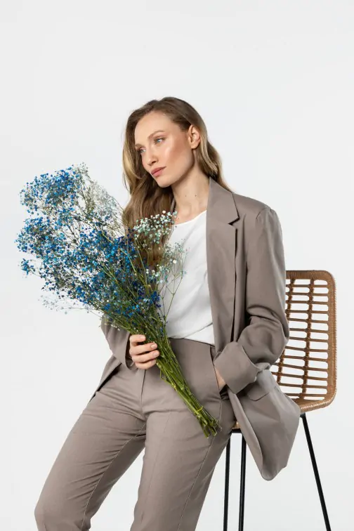 Lniana marynarka o klasycznym kroju to elegancki i ponadczasowy element garderoby, który doskonale uzupełnia zarówno formalne, jak i codzienne stylizacje. Prosty, lekko luźniejszy fason pięknie układa się na sylwetce, zapewniając swobodę ruchów i komfort noszenia. Klasyczny kołnierz z klapami nadaje całości eleganckiego charakteru, a zapięcie na jeden guzik podkreśla minimalistyczny styl modelu. Marynarka posiada długie rękawy oraz praktyczne kieszenie z patkami z przodu. Wykonana z naturalnej lnianej tkaniny jest lekka i przewiewna, dzięki czemu świetnie sprawdzi się w cieplejsze dni. To uniwersalny model, który doskonale wygląda zarówno w komplecie z lnianymi spodniami, jak i w zestawieniu z sukienką lub jeansami.